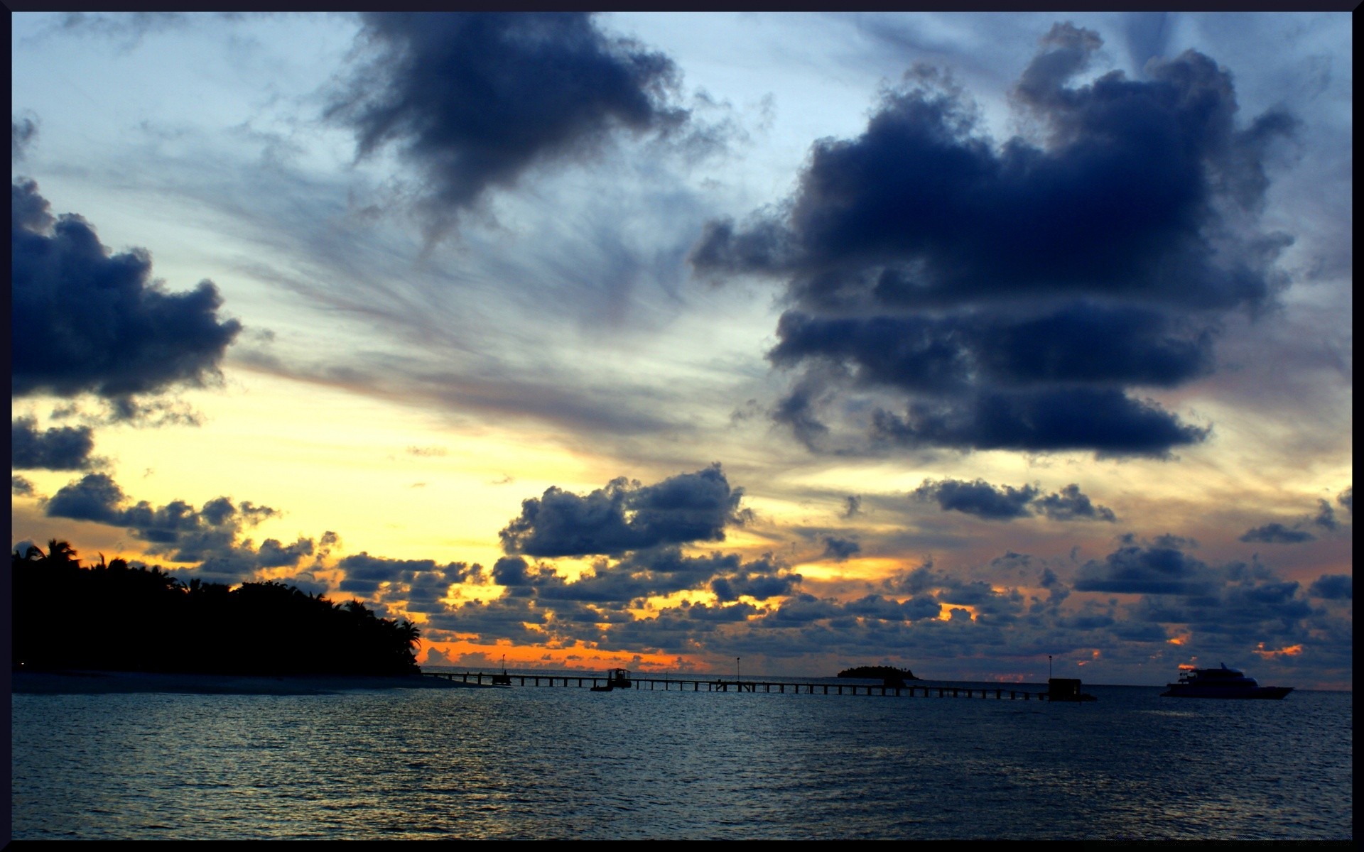 Palma en el fondo de la playa y la puesta de sol en tonos naranjas