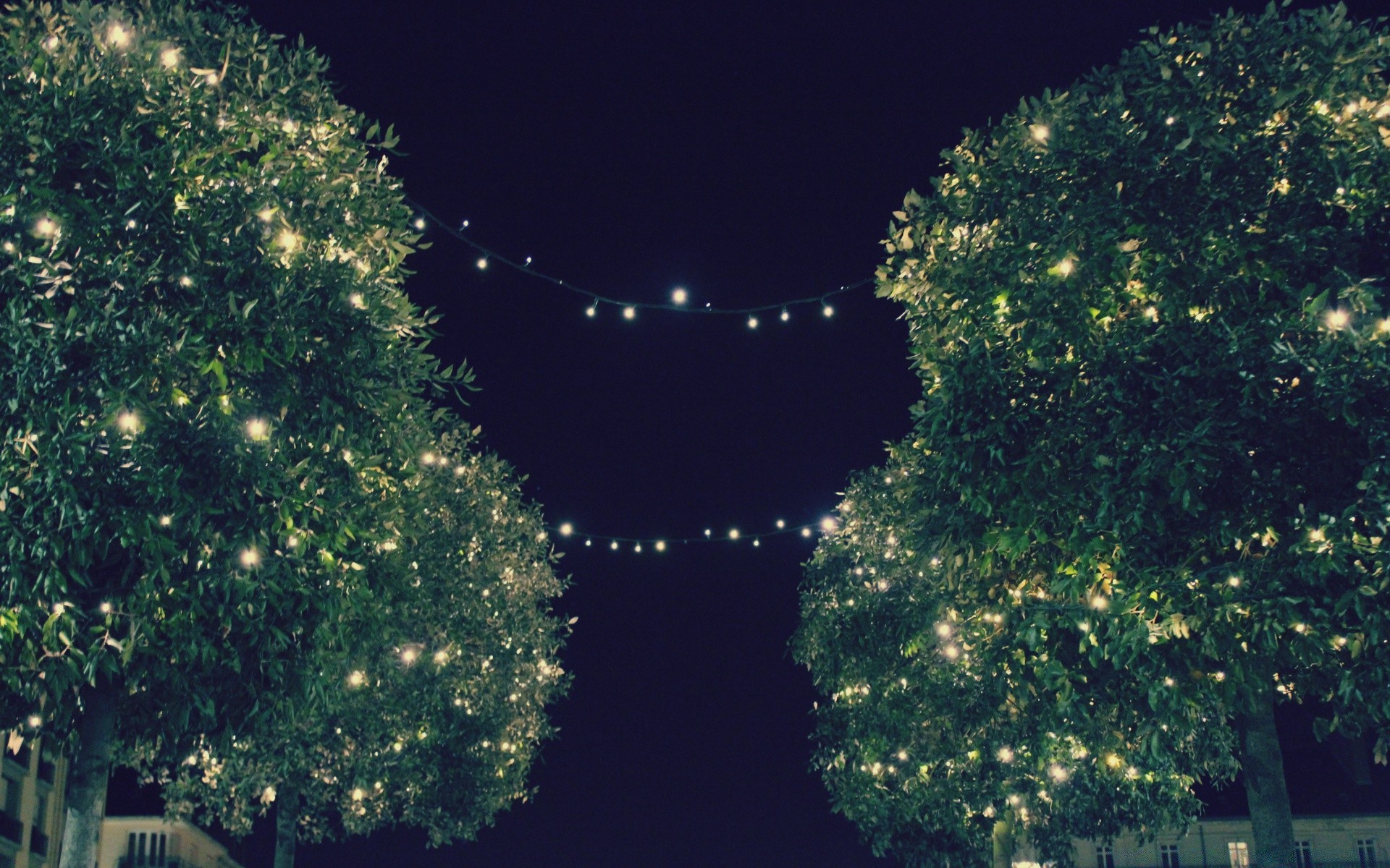 Árboles decorados con guirnaldas de Navidad en la oscuridad
