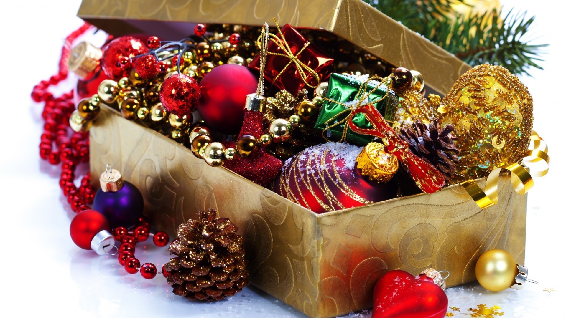 Caja llena de diferentes juguetes de Navidad