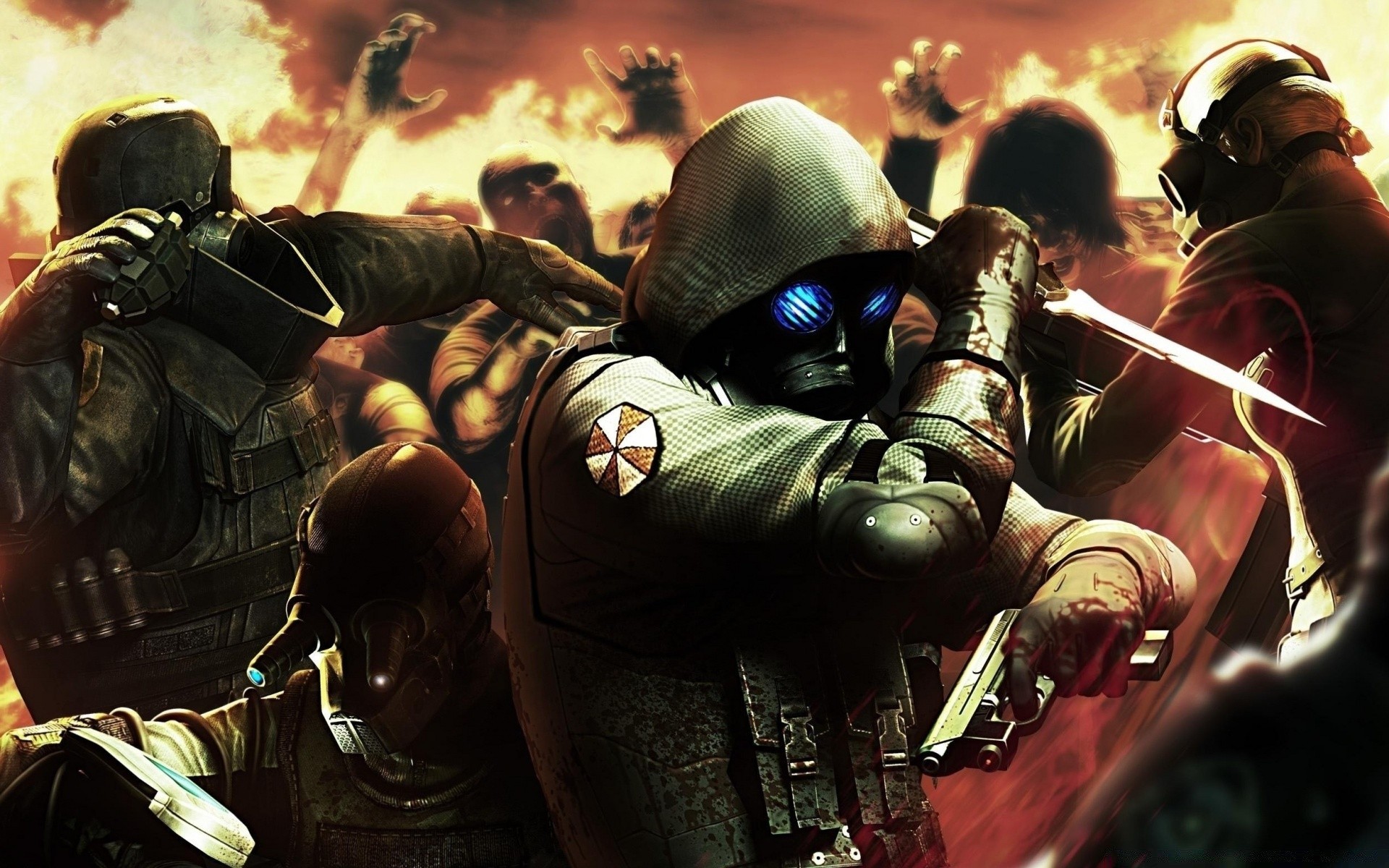 Resident evil. Post-Apocalipsis. Batalla. Hombre con máscara de gas con pistola y daga