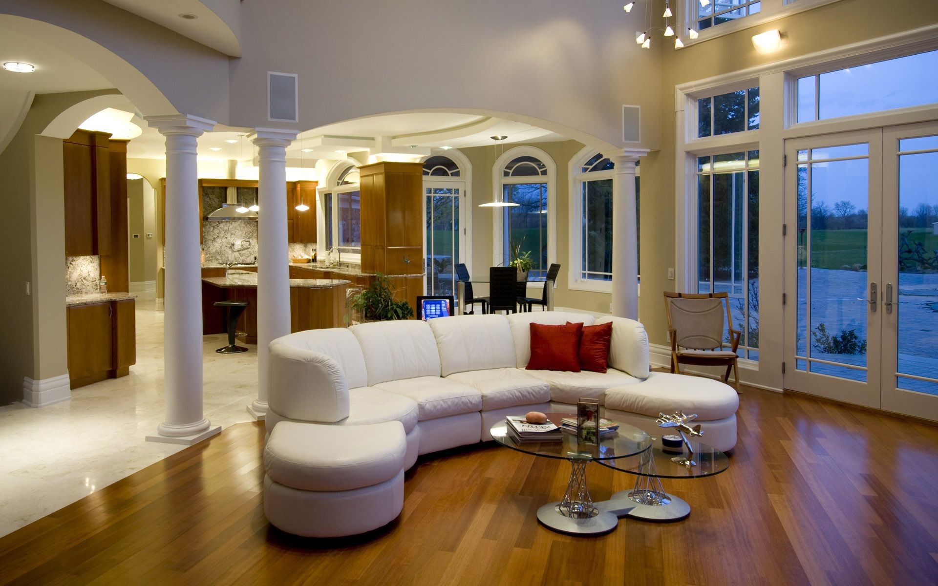 Bonita habitación. hotel. Sofá blanco con cojines rojos