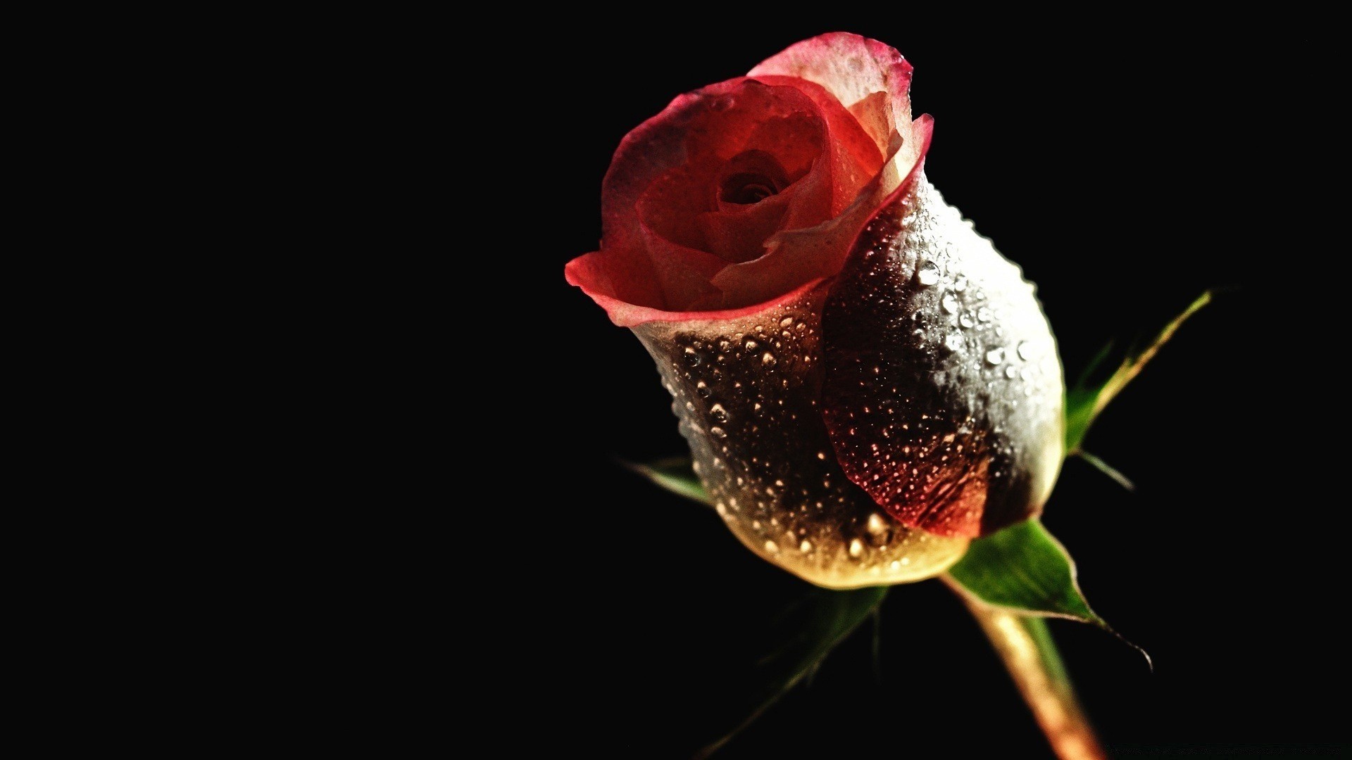 Rocío sobre un capullo de rosa sobre un fondo negro
