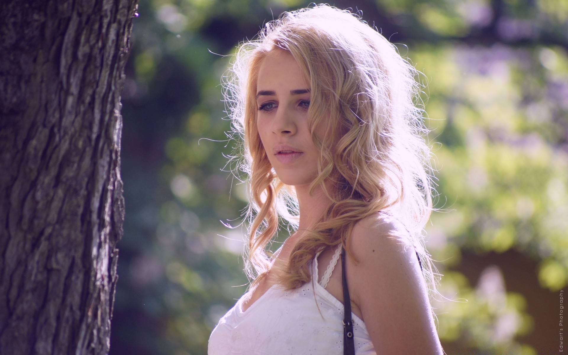 Chica rubia en Top blanco en la naturaleza
