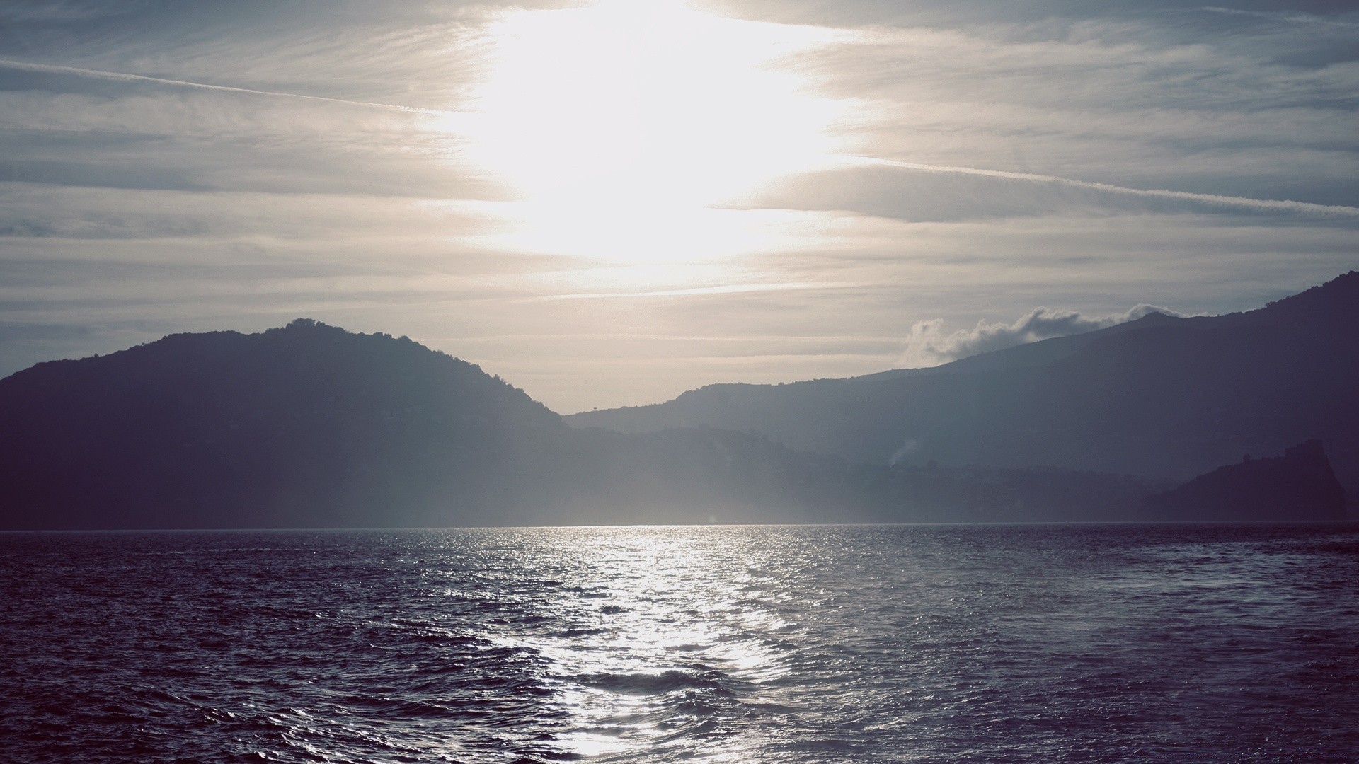 Reflejo del sol en el lago en el fondo de las montañas