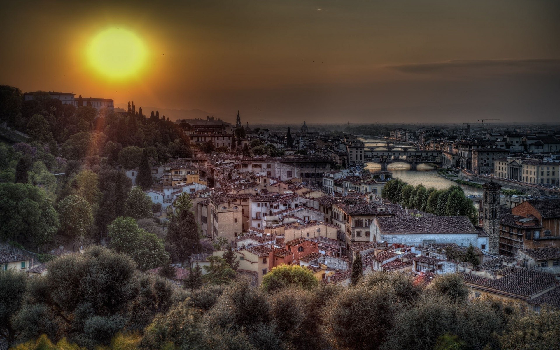 Fuego, campo, puesta de sol y río