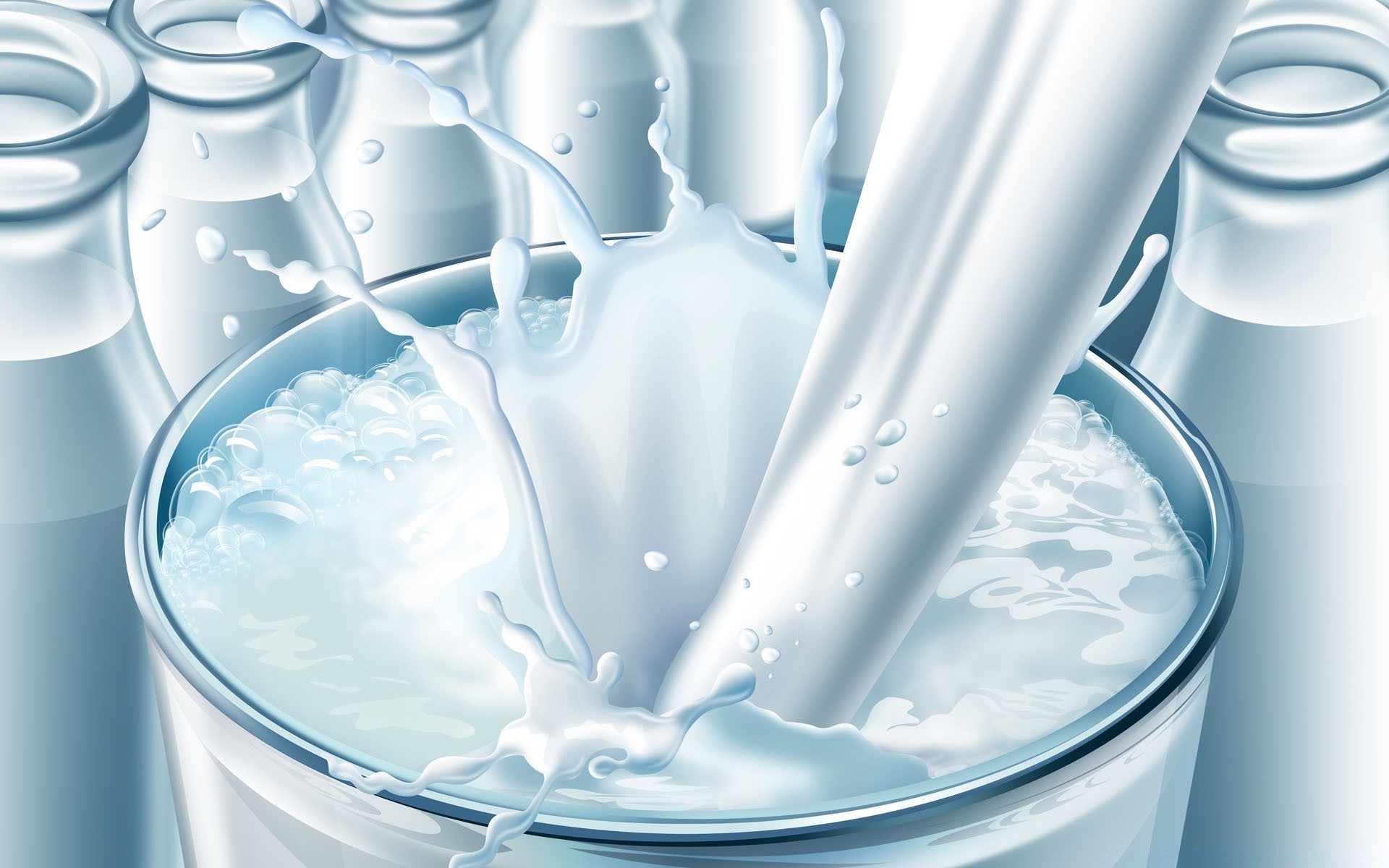 Animación de la leche que se vierte en un vaso entre botellas llenas de leche