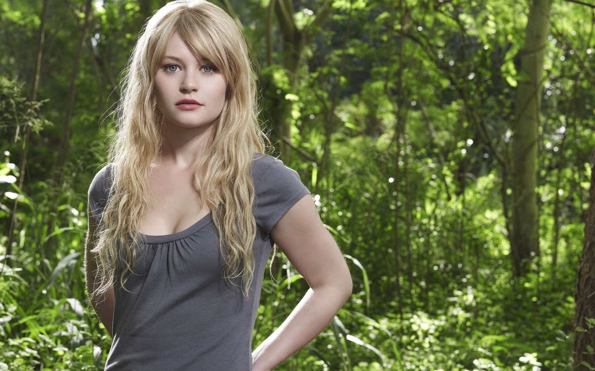 Ricitos de oro en una camiseta gris camina en el verde del bosque