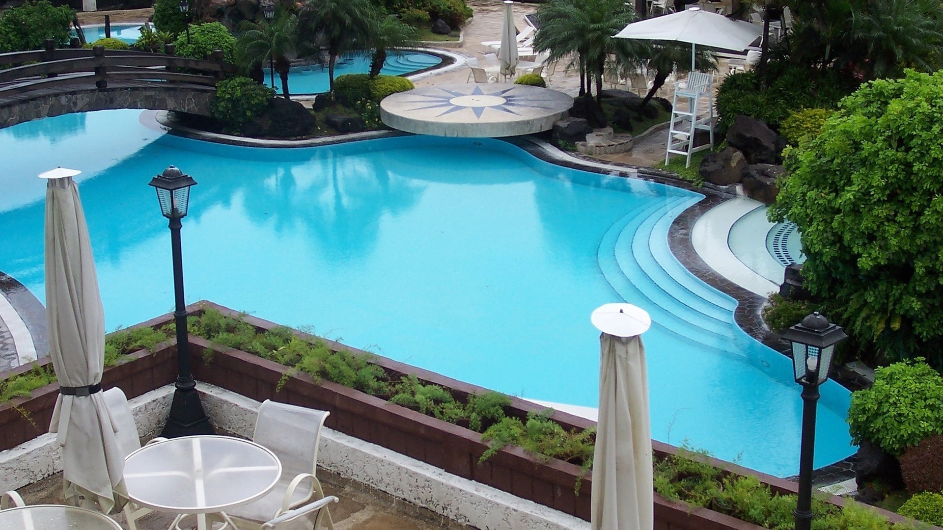 Vista desde el balcón a la elegante piscina de agua azul