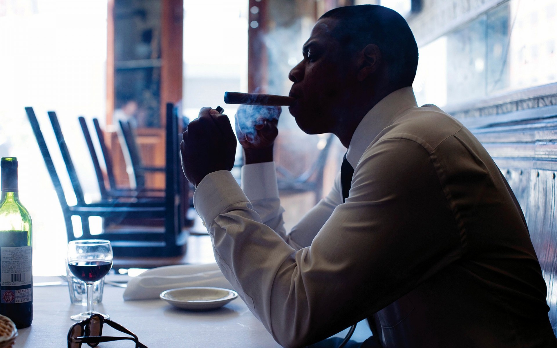 Hombre de negocios fumando con una Copa de vino