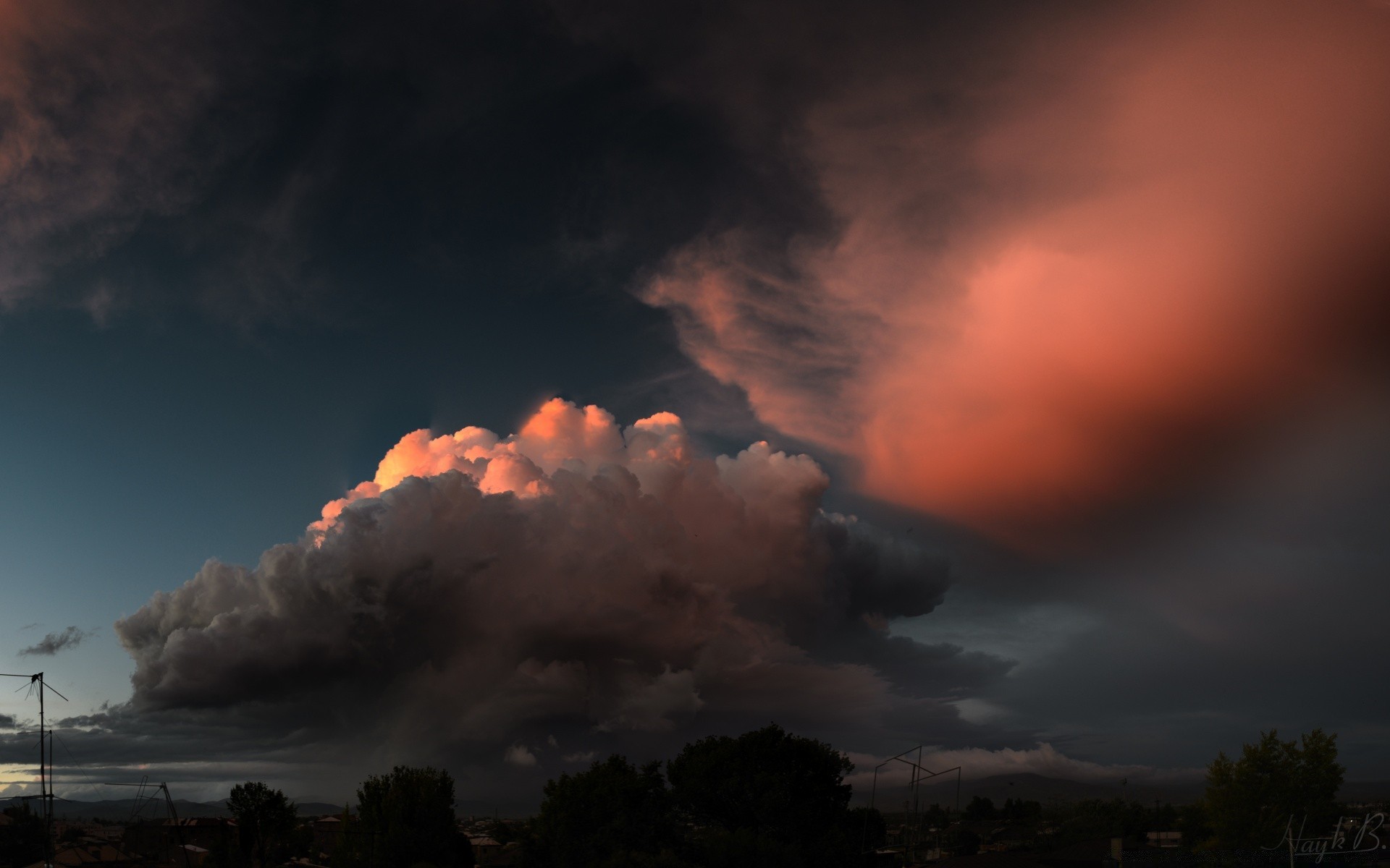 Árboles con hojas rojas y los rayos del sol de otoño que se abren paso a través de la niebla