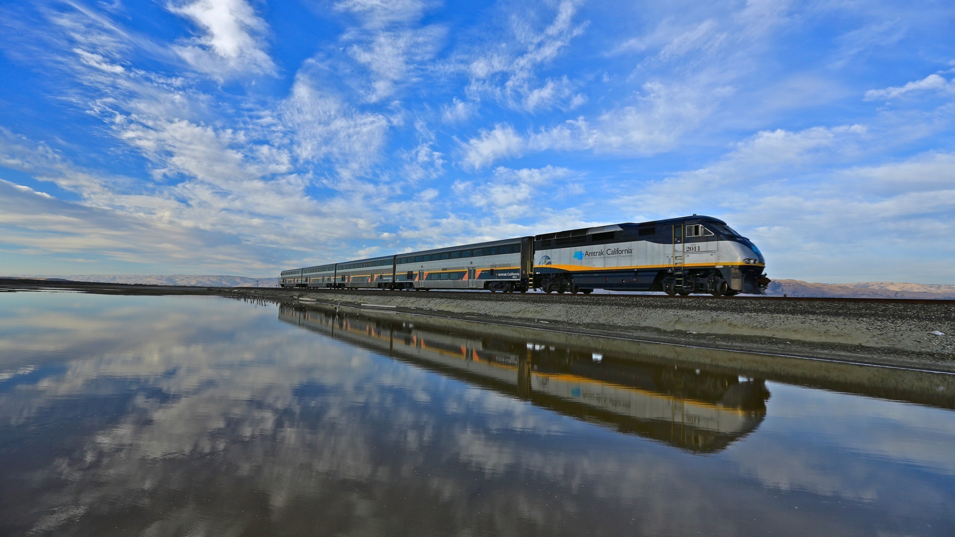 Entre dos mundos sin fronteras (imagen de espejo de un tren bajo un cielo azul)