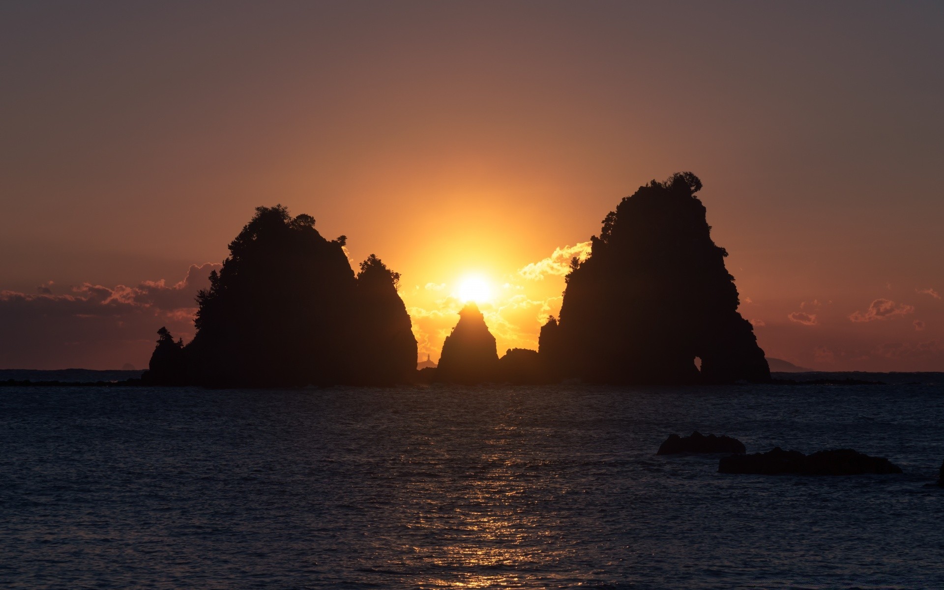 Puesta de sol sobre la isla en el mar