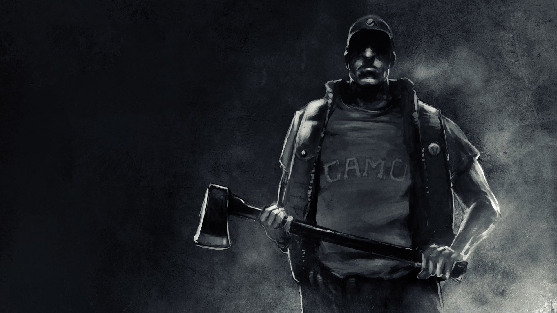 Un hombre con una gorra de béisbol y un hacha en la oscuridad