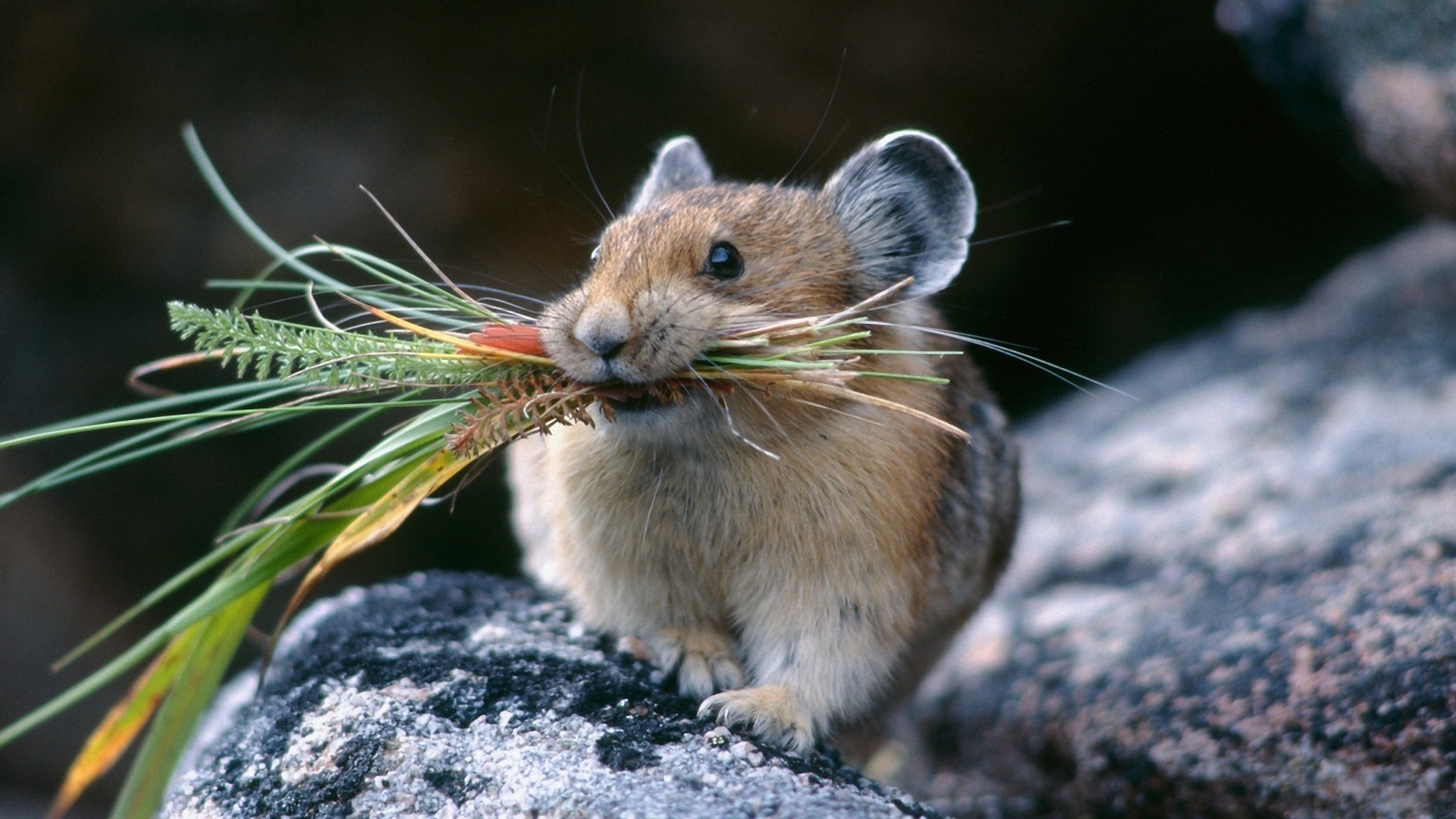 Hámster salvaje con un ramo de hierbas en los dientes en un entorno natural