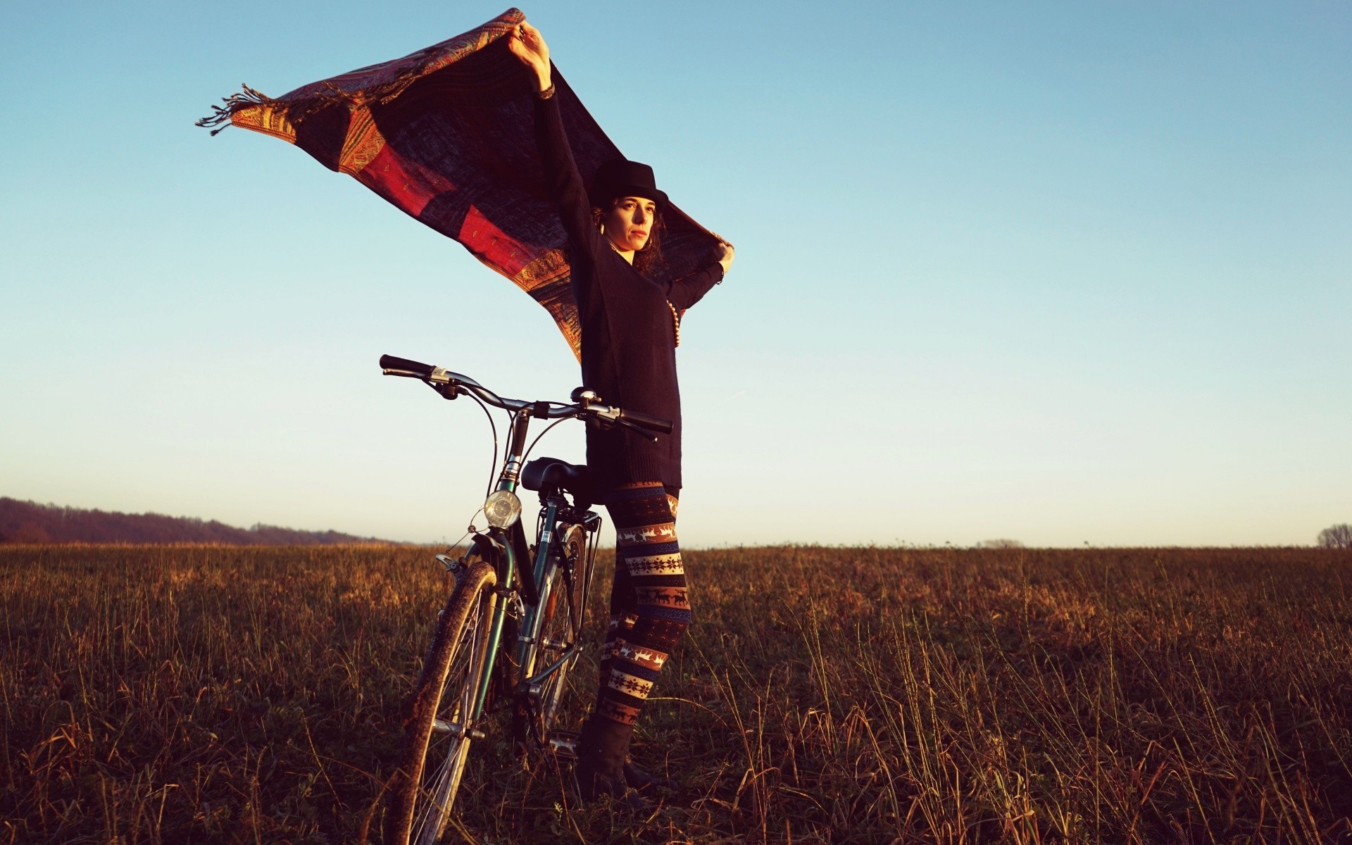 Una chica con una bicicleta sostiene un pañuelo sobre su cabeza en el vientoUna chica con una bicicleta sostiene un pañuelo sobre su cabeza en el viento