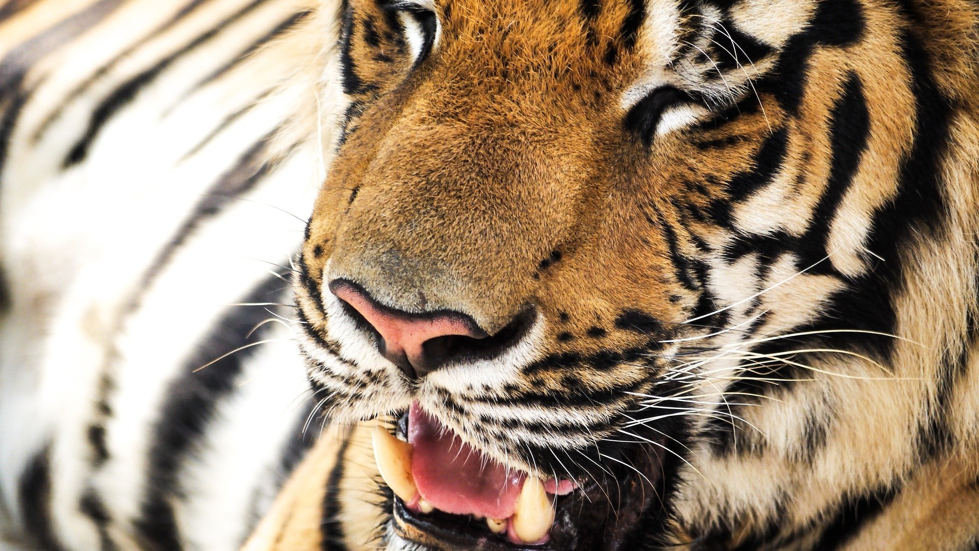 El tigre de Amur Dulcemente bosteza exponiendo sus enormes colmillos