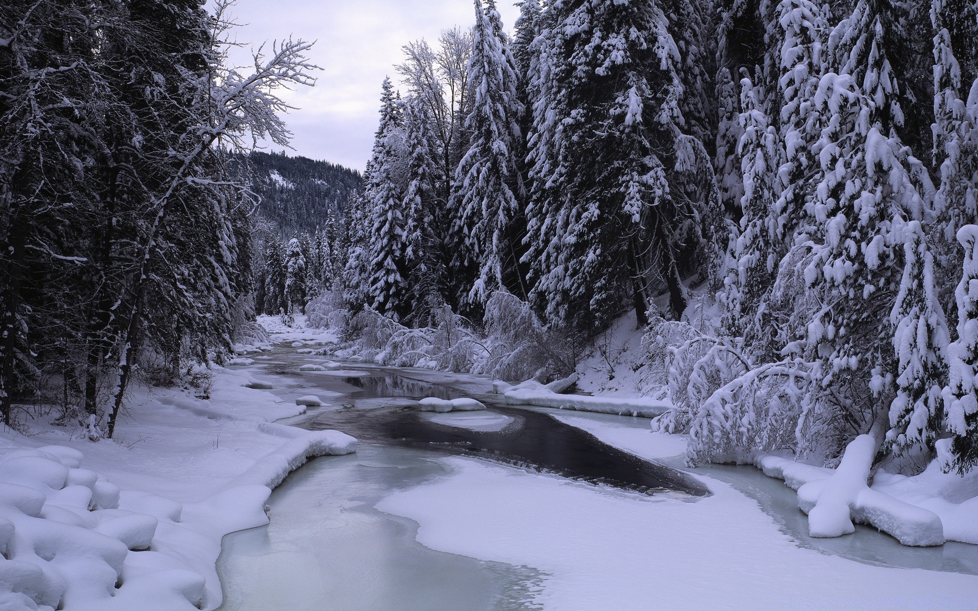 Paisaje invernal, terreno montañoso y bosques de coníferas