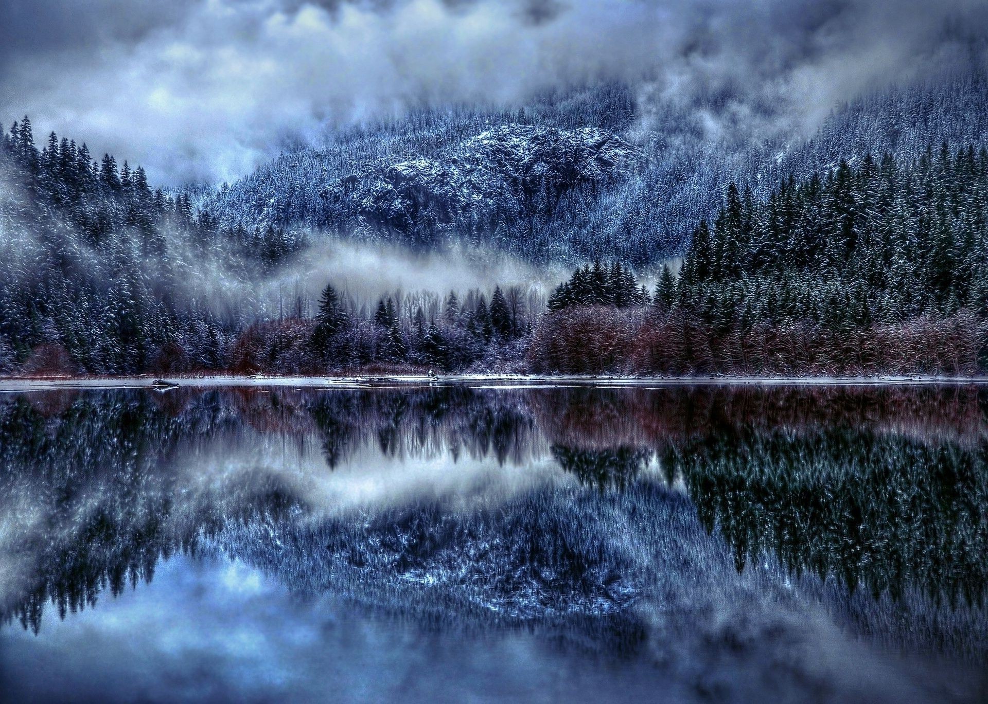 Montañas de invierno y bosque junto al río