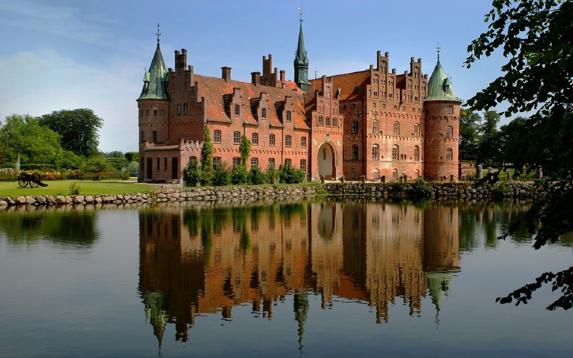 En ambas orillas del río azul iglesias y árboles verdes contra el cielo azul