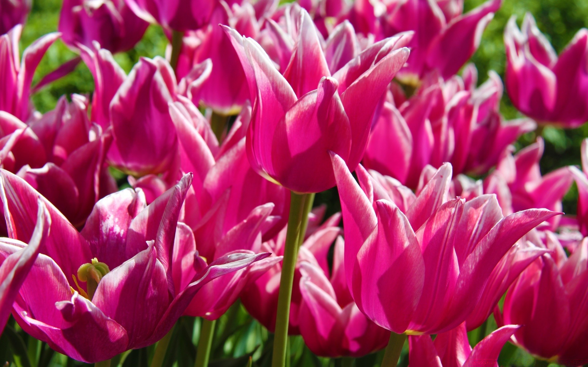 Tulipanes amarillos en una cama de flores bajo los rayos del solTulipanes amarillos en una cama de flores bajo los rayos del sol