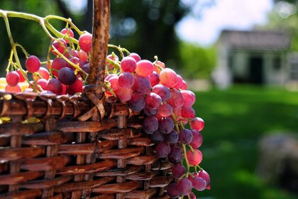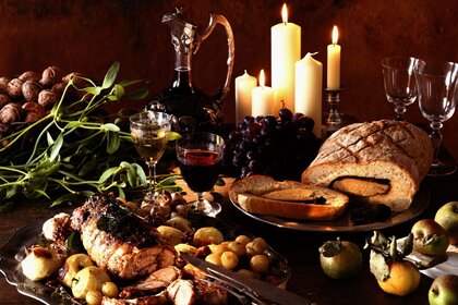 Bodegón con fruta y una Copa de vino sobre un fondo de pizarra
