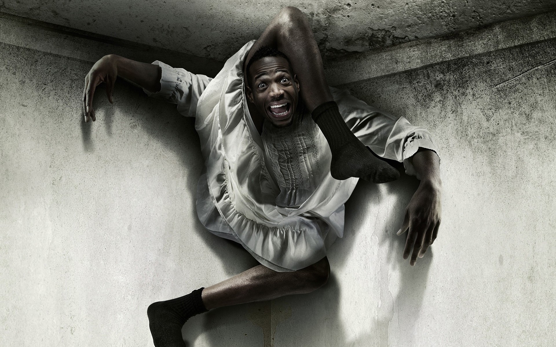 Hombre de ébano en la esquina de la habitación bajo el techo