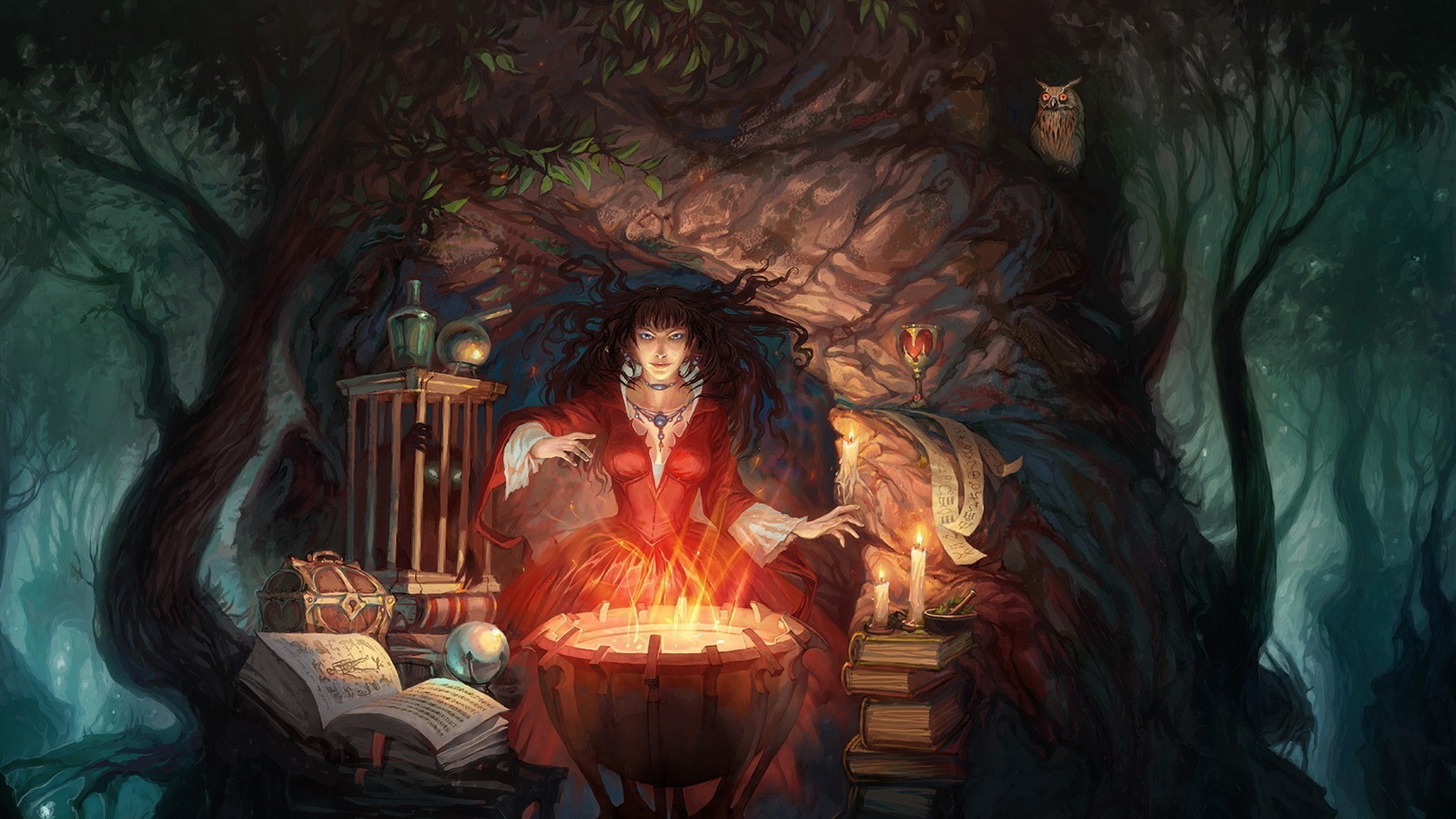 Una bruja prepara una poción en su casa