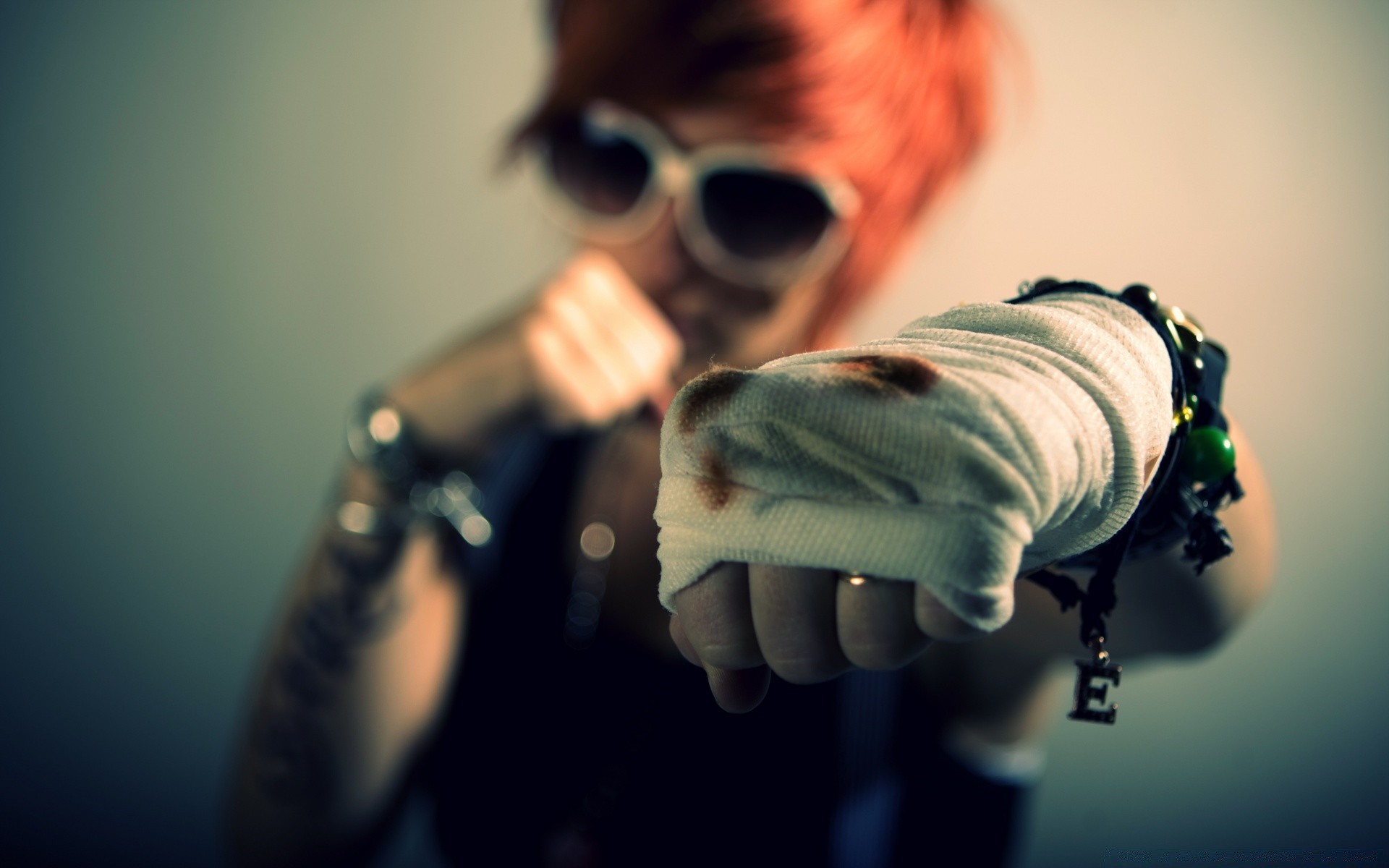 Kigboxing. Chica con gafas de sol con la mano vendada