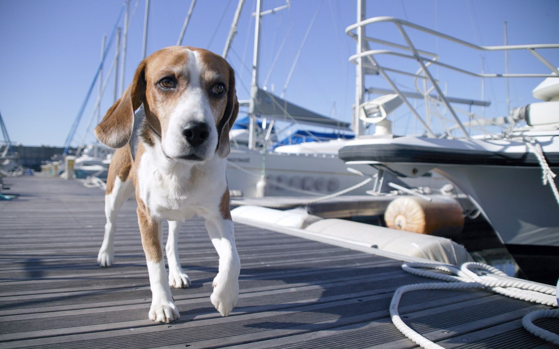 Perro blanco y rojo corriendo por el muelle