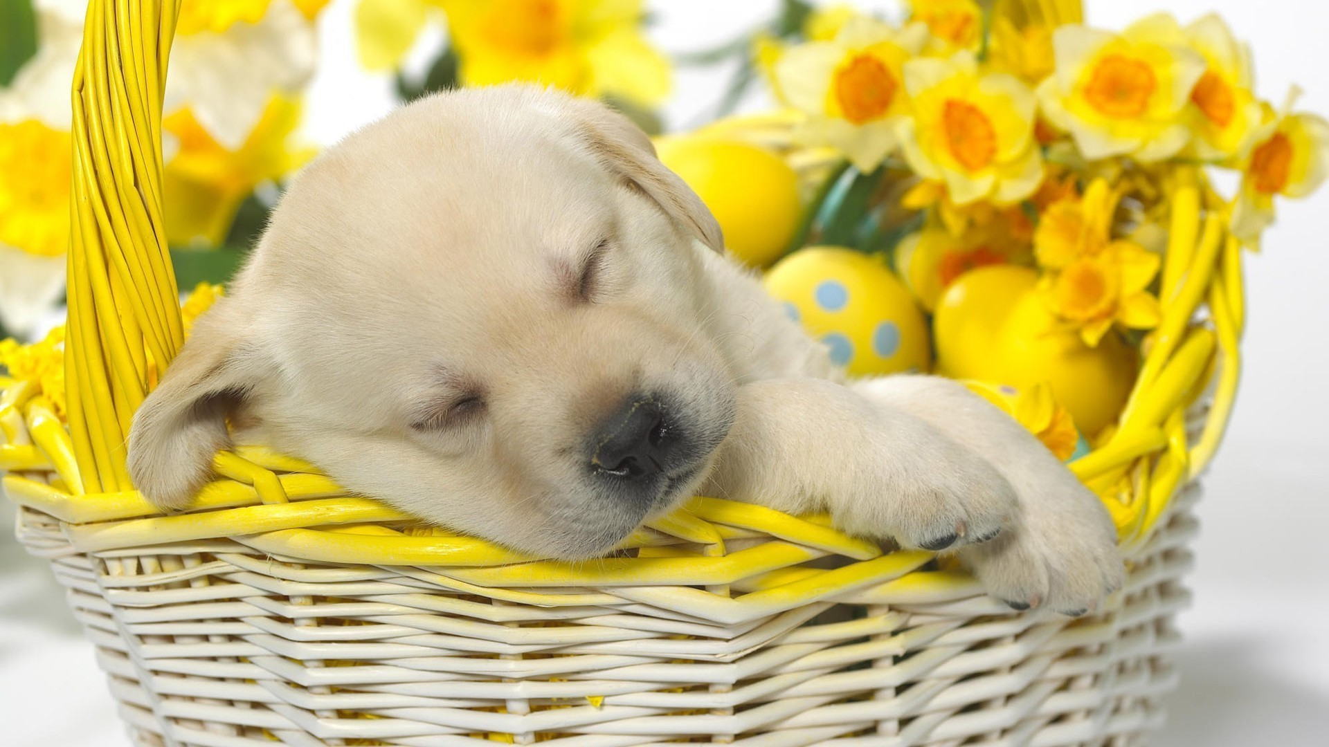 Lindo cachorro en una cesta para Pascua