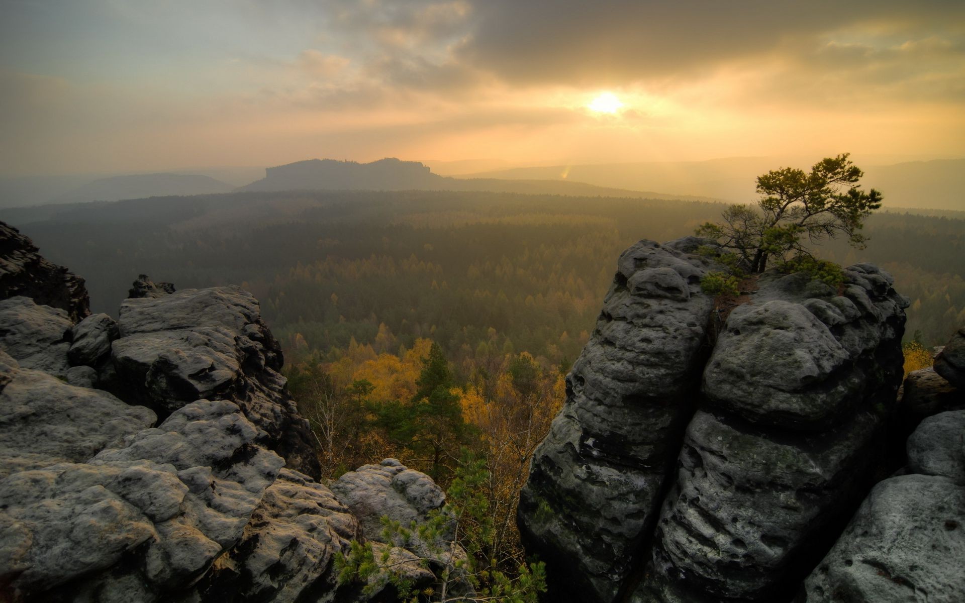Vista desde el acantilado hasta el amanecer brumoso