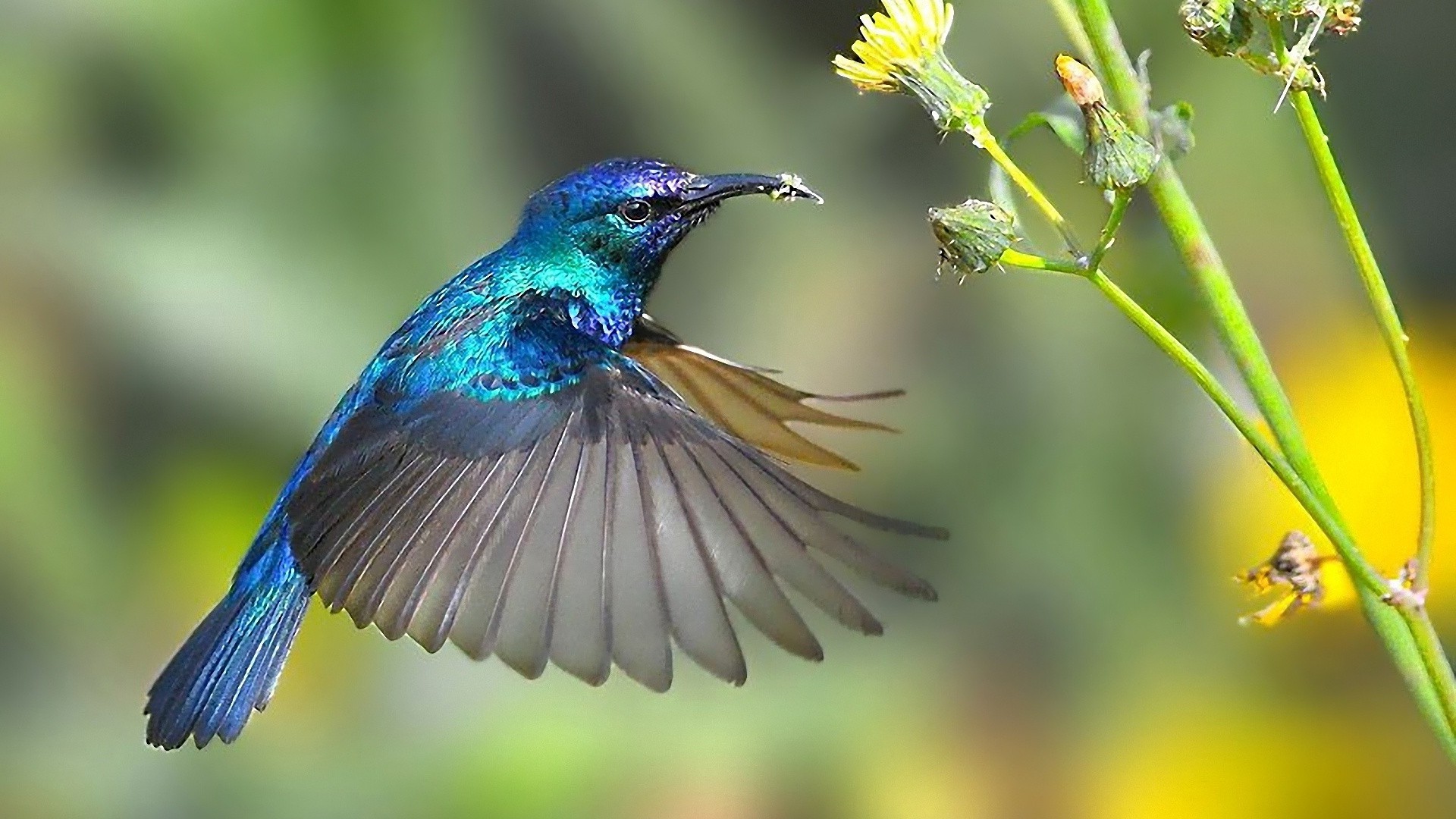 Pájaro congelado en vuelo junto a las flores
