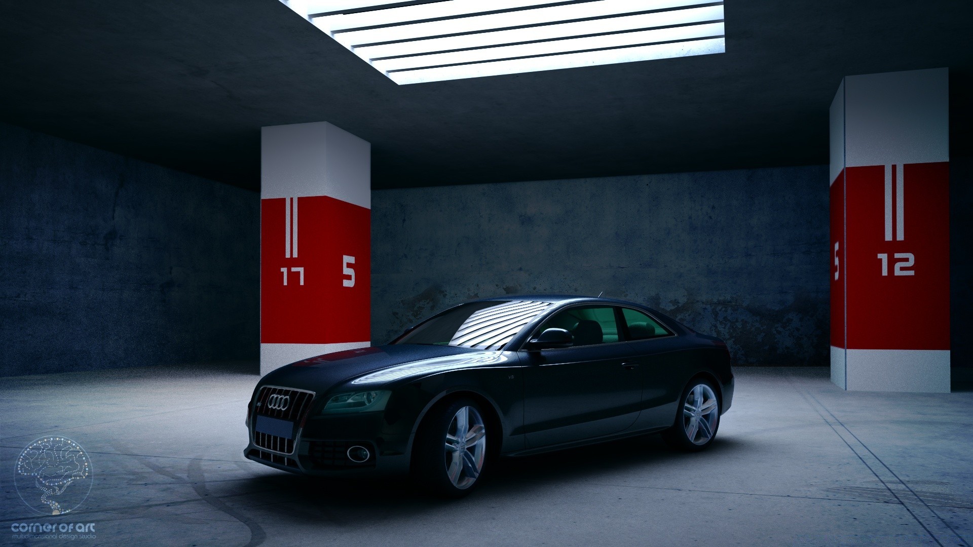 Coche parado en el estacionamiento subterráneo entre los postes blancos y rojos con números