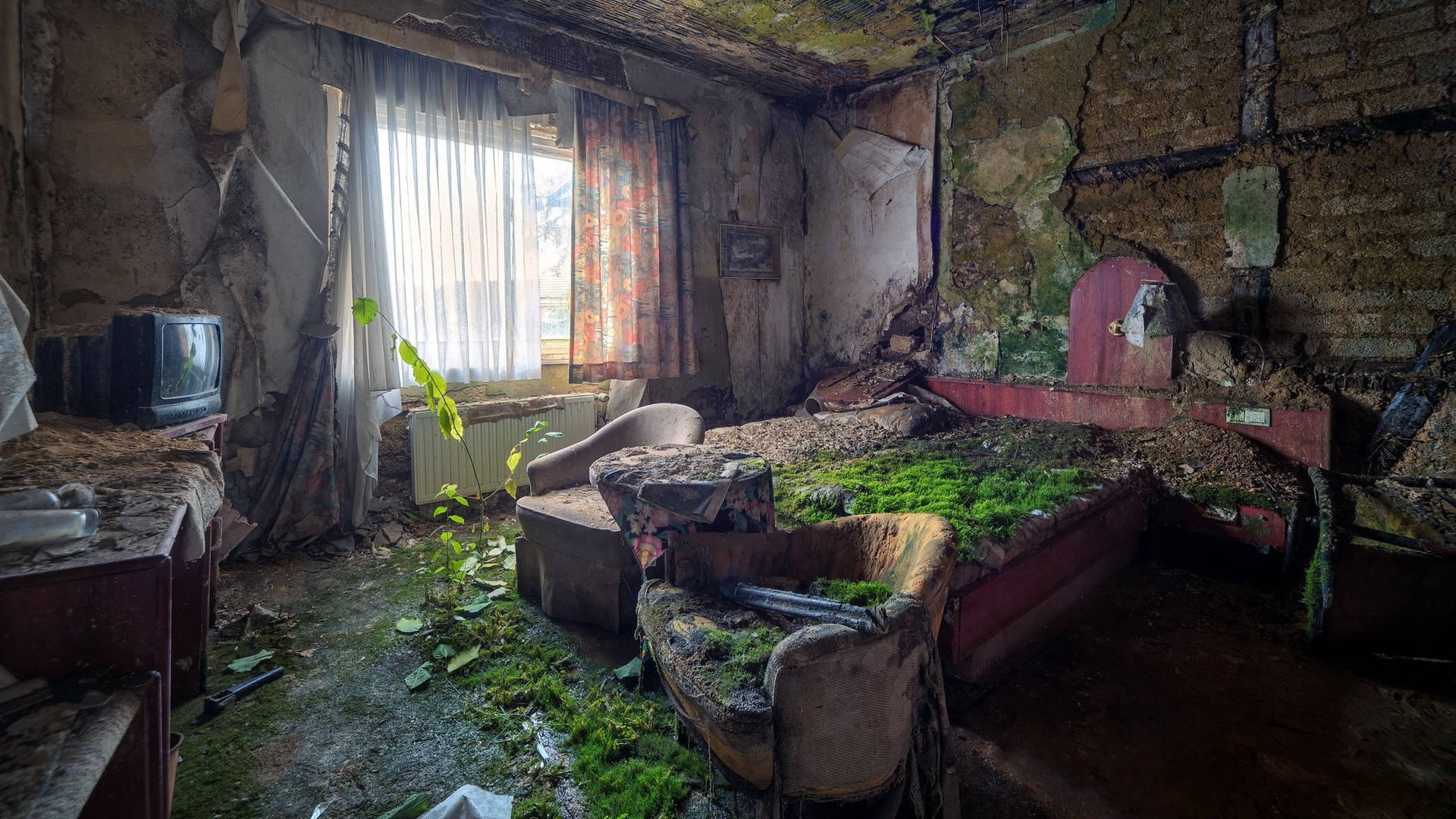 Un hombre solitario en una habitación abandonada con poca luzUn hombre solitario en una habitación abandonada con poca luz