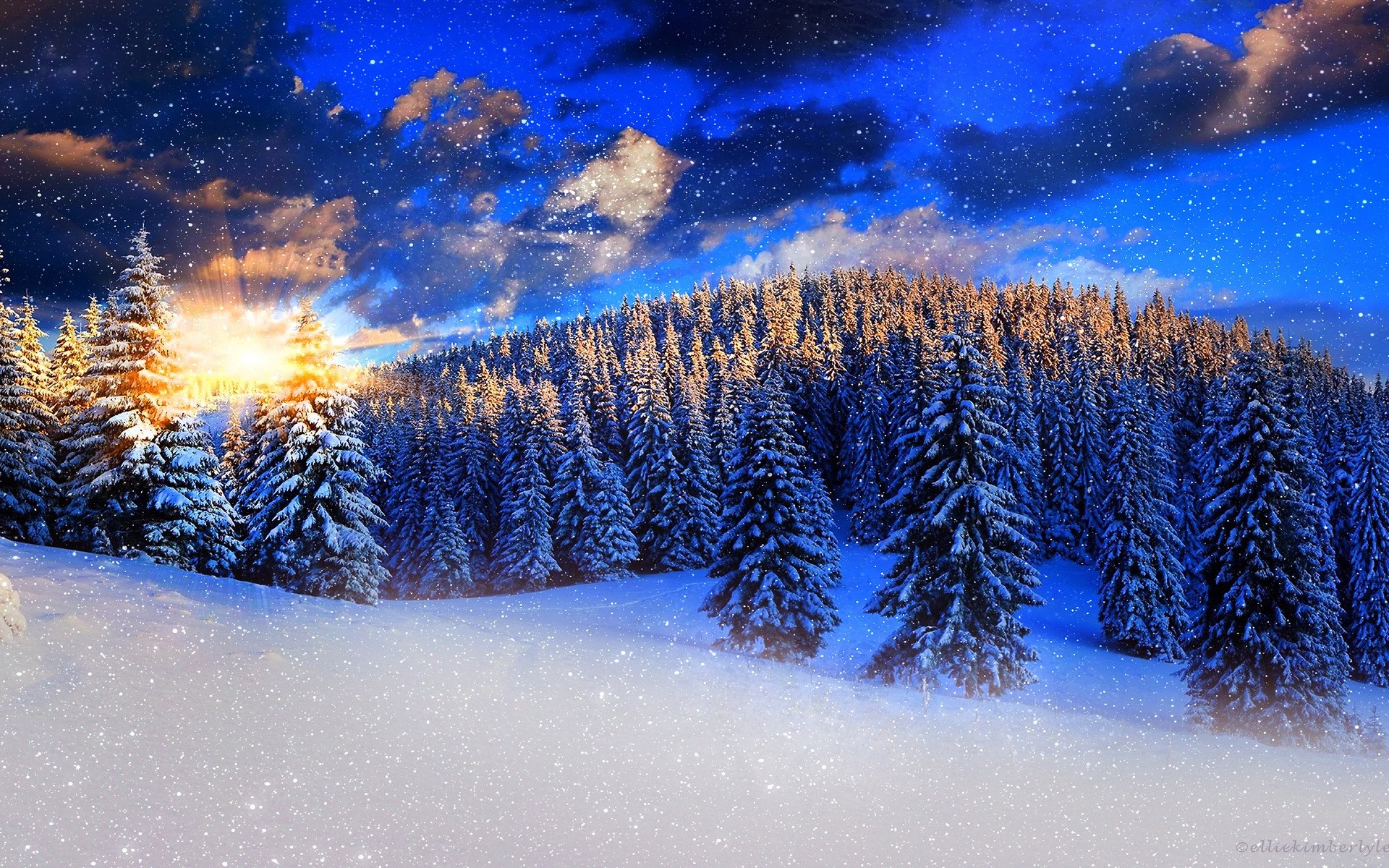 Bosque de invierno con árboles de Navidad cubiertos de nieve y amanecer