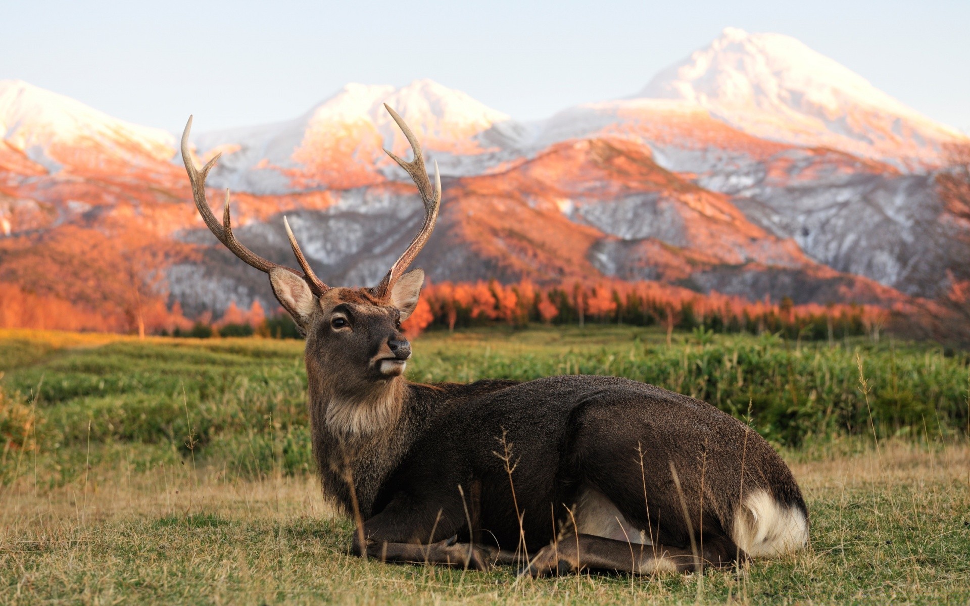 El ciervo descansa sobre la hierba en medio de las montañas