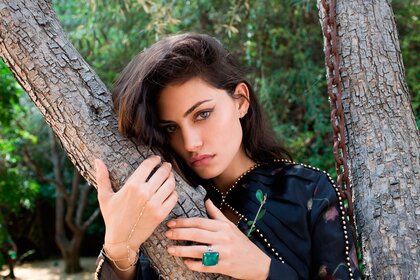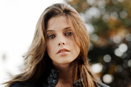 Una mujer con un pasador lateral en forma de mariposa sonríe y Mira a un lado