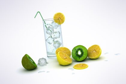 Agua con limón y hielo en un vaso alto