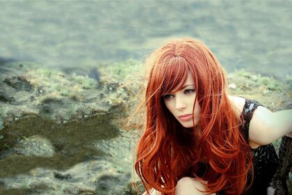 Hermosa chica con pelo rojo grueso junto al agua