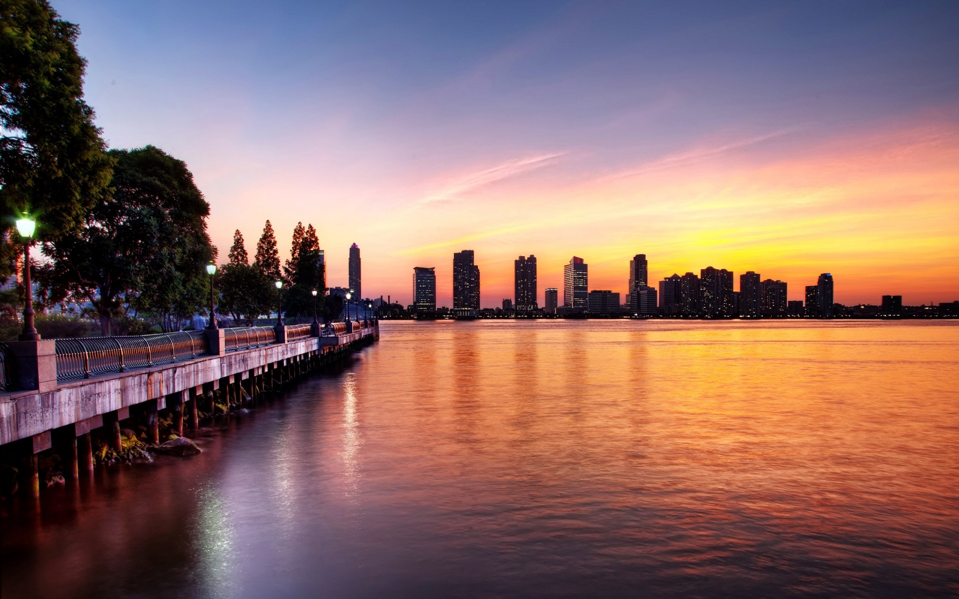 Niebla de la mañana sobre el agua cerca de la ciudad