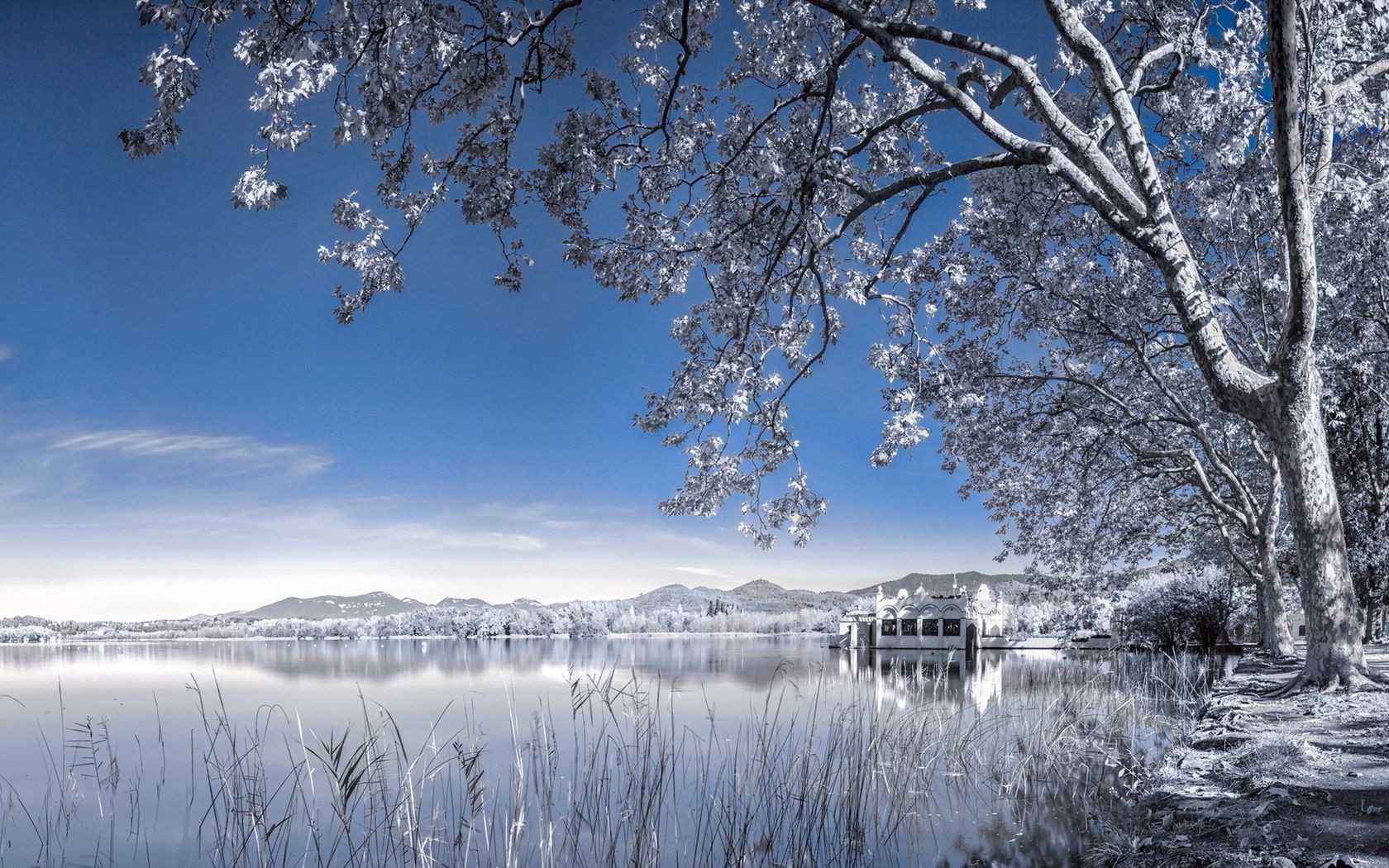 Casa junto al lago en la temporada de invierno