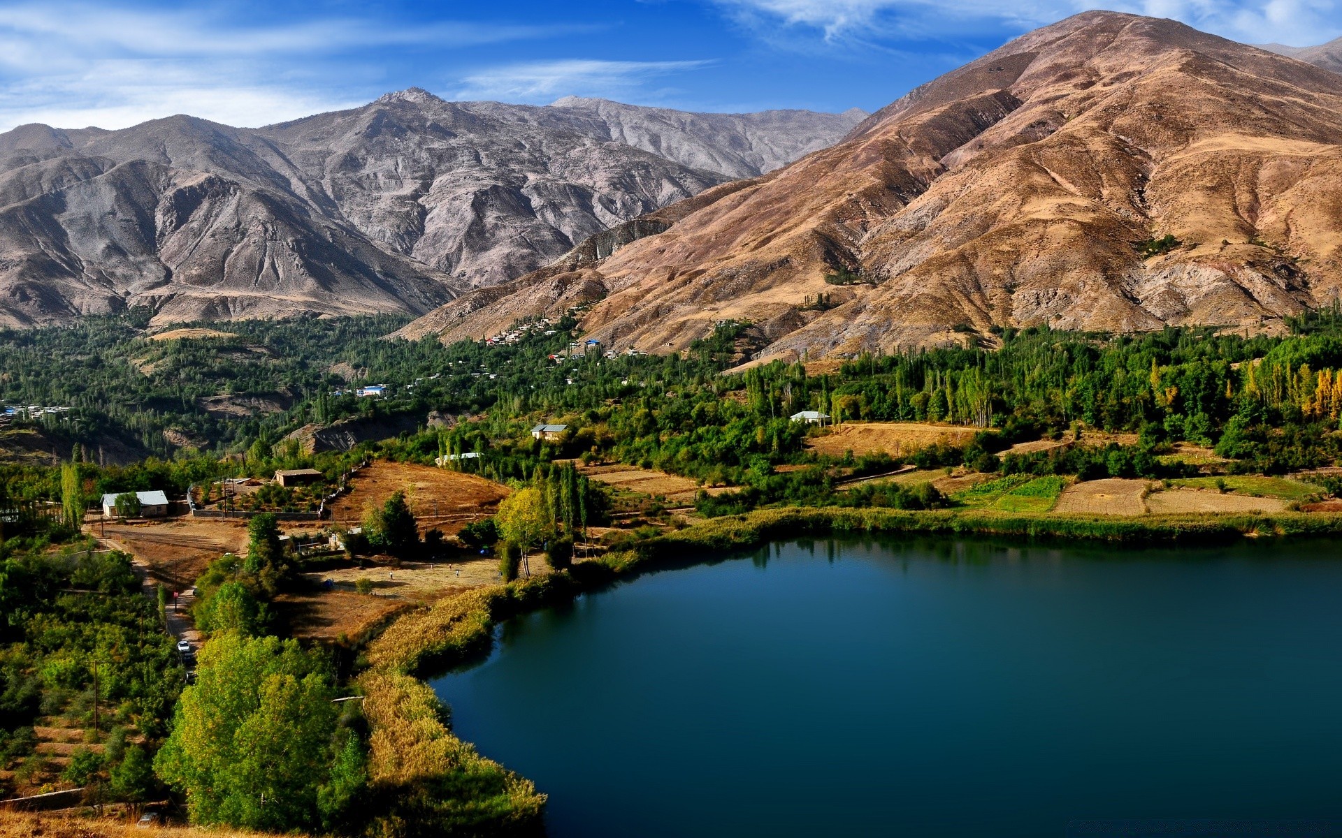 Pequeño asentamiento en las montañas junto al lagoPequeño asentamiento en las montañas junto al lago