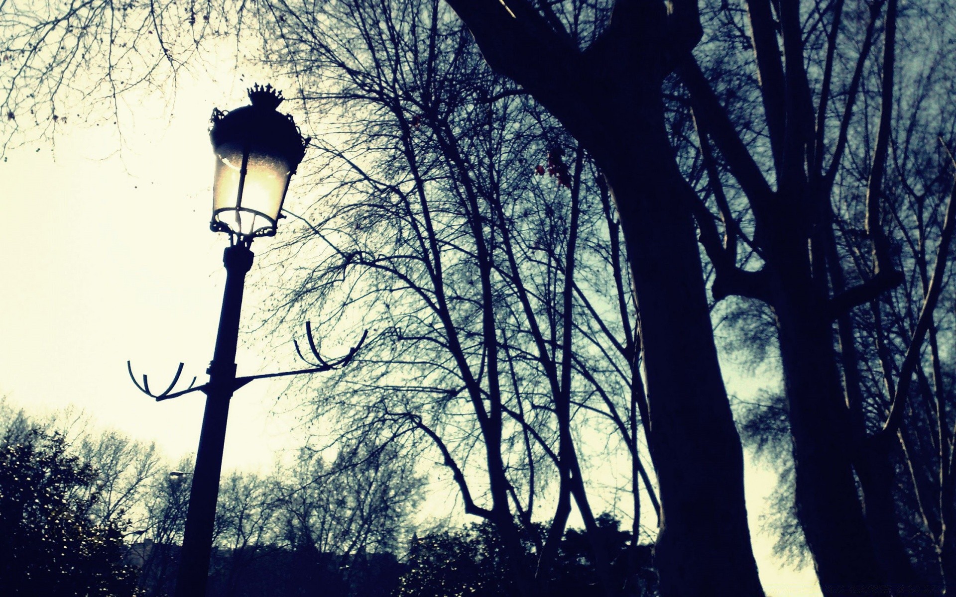 Linterna y siluetas de árboles contra el cielo al atardecerLinterna y siluetas de árboles contra el cielo al atardecer