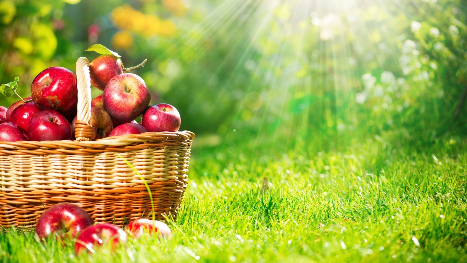 Cesta de manzanas rojas bajo el sol en la hierba