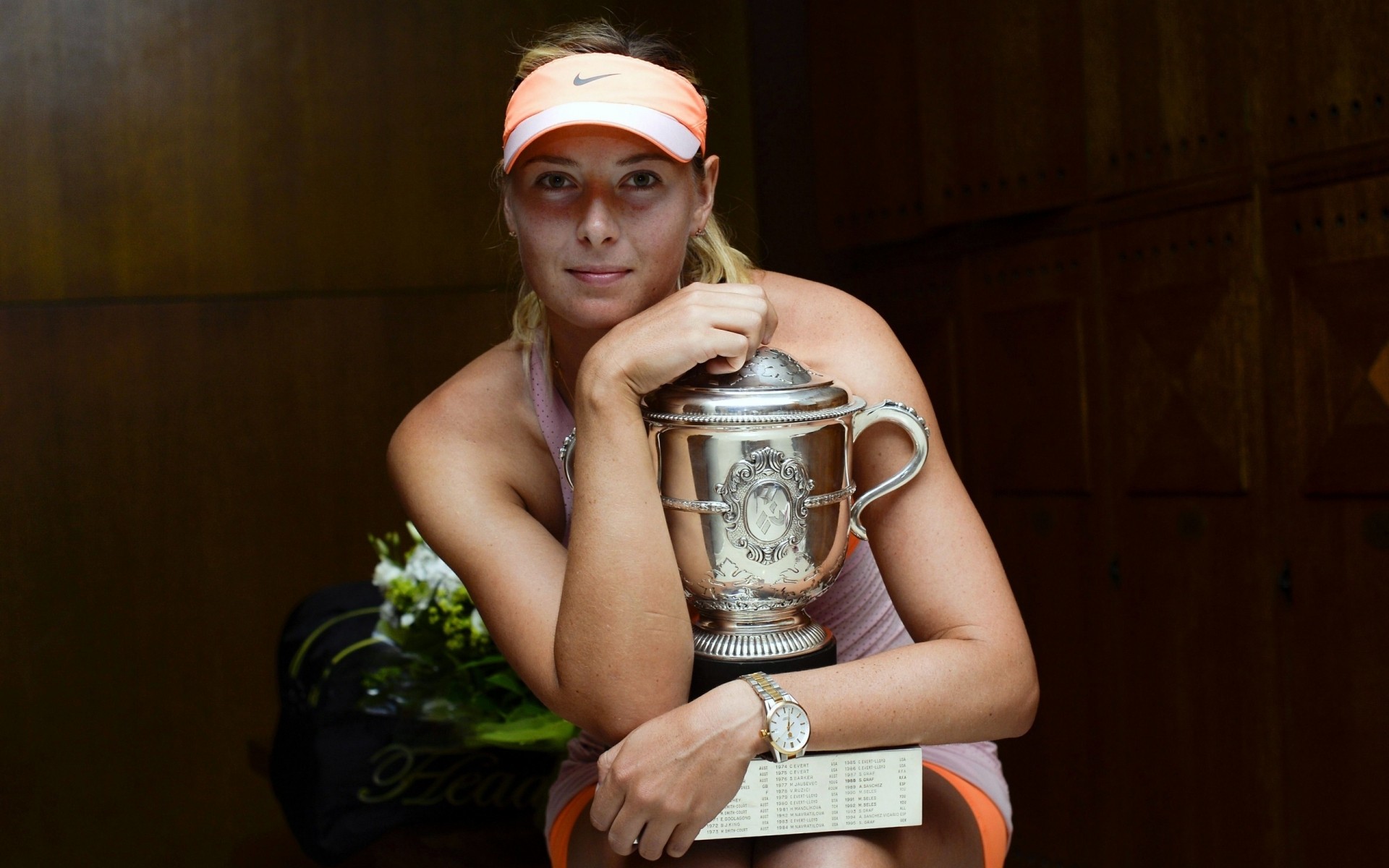 La tenista se sienta abrazada con una copa deportivaLa tenista se sienta abrazada con una Copa deportiva