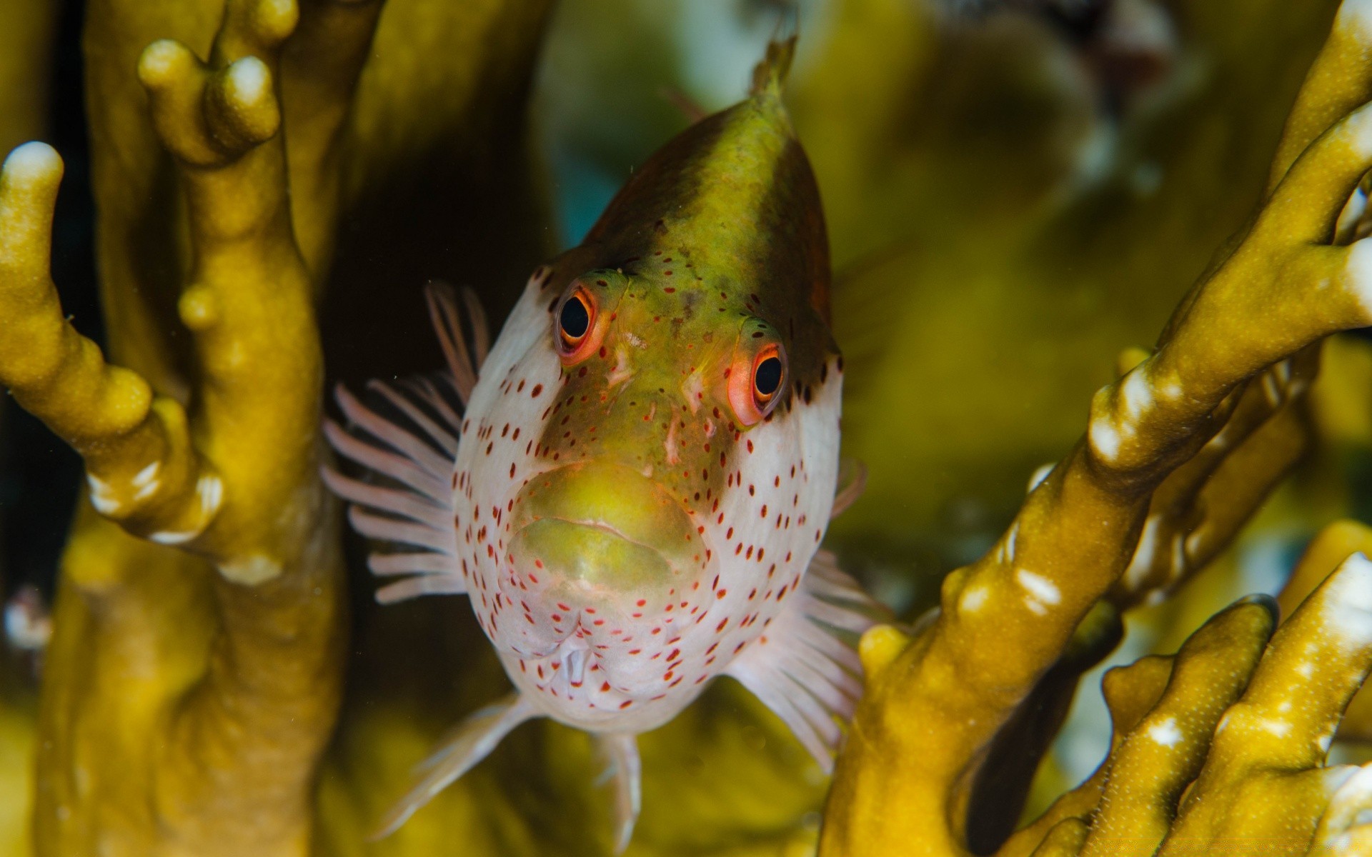 Muchos peces pequeños alrededor del Coral
