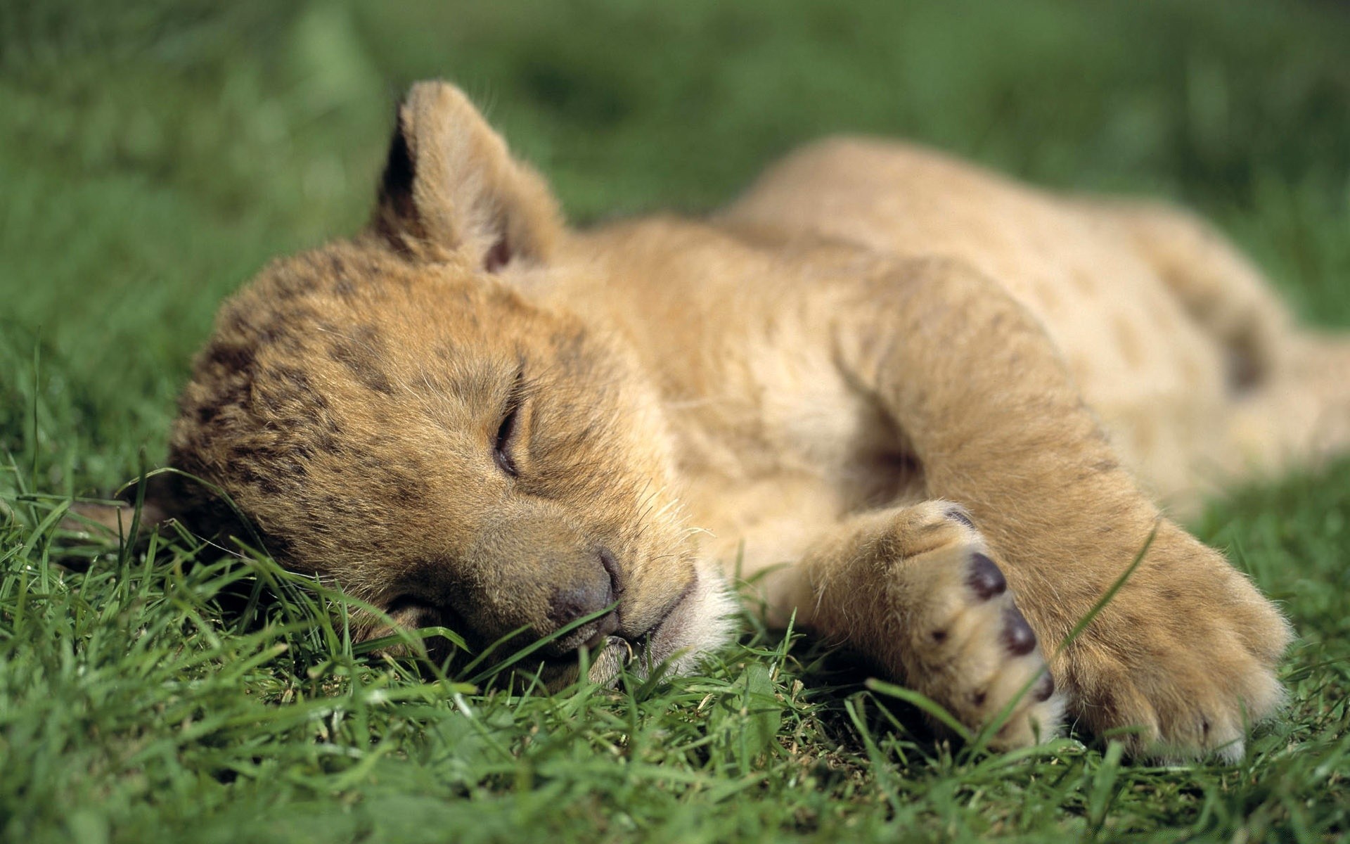 Cachorro de León dormido yace en la hierba