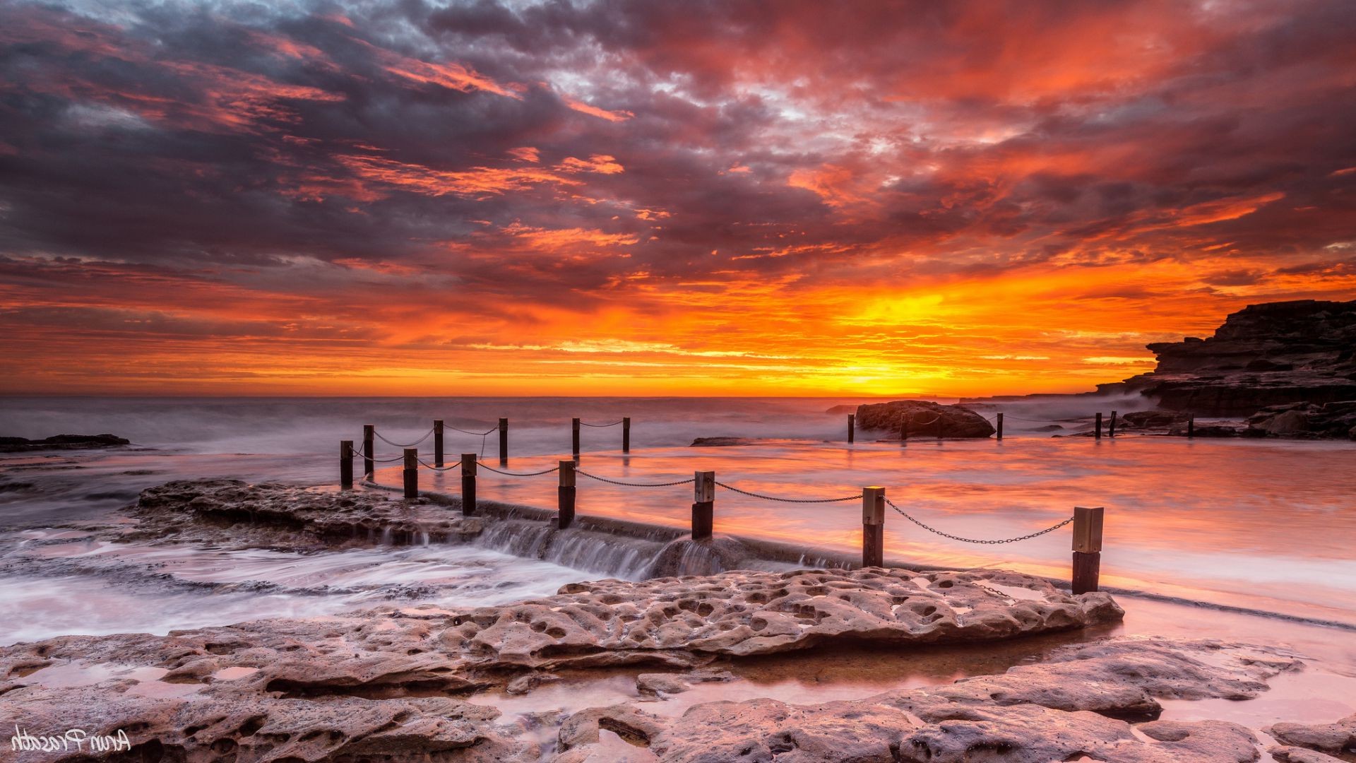 Paisaje de rocas congeladas en el hielo. Puesta de sol en el mar de invierno