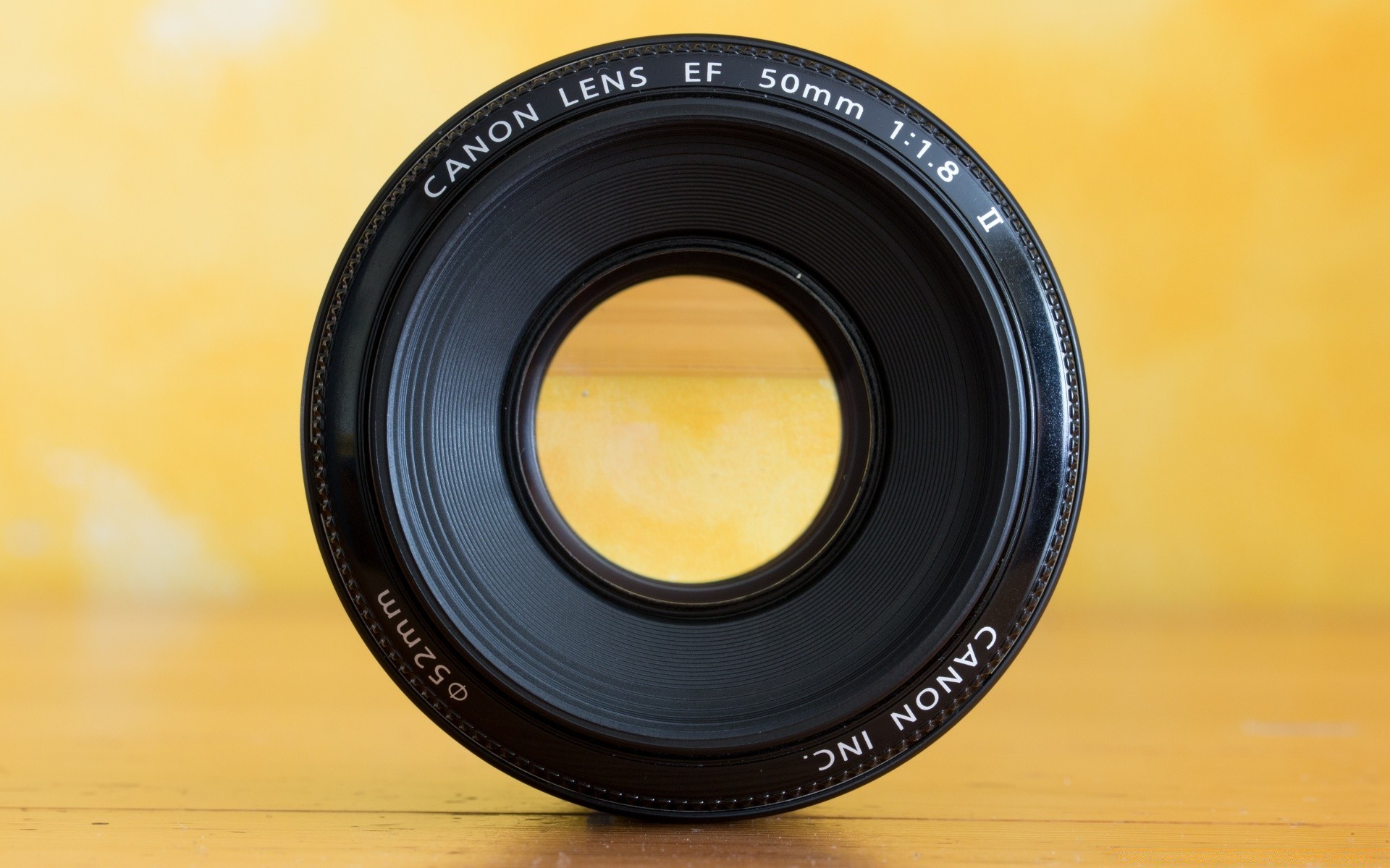 Lente de cámara canon sobre fondo amarillo
