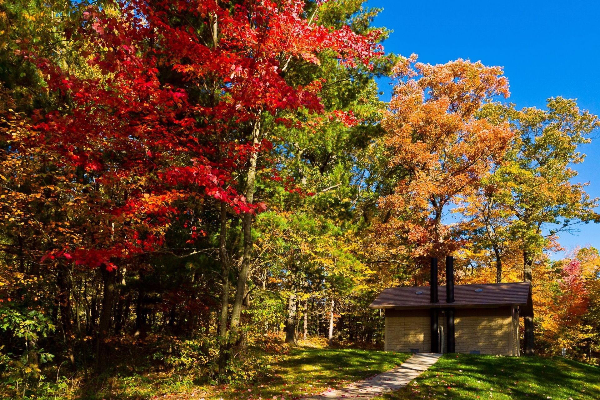 Paisaje otoñal de árboles con hojas amarillas y rojas